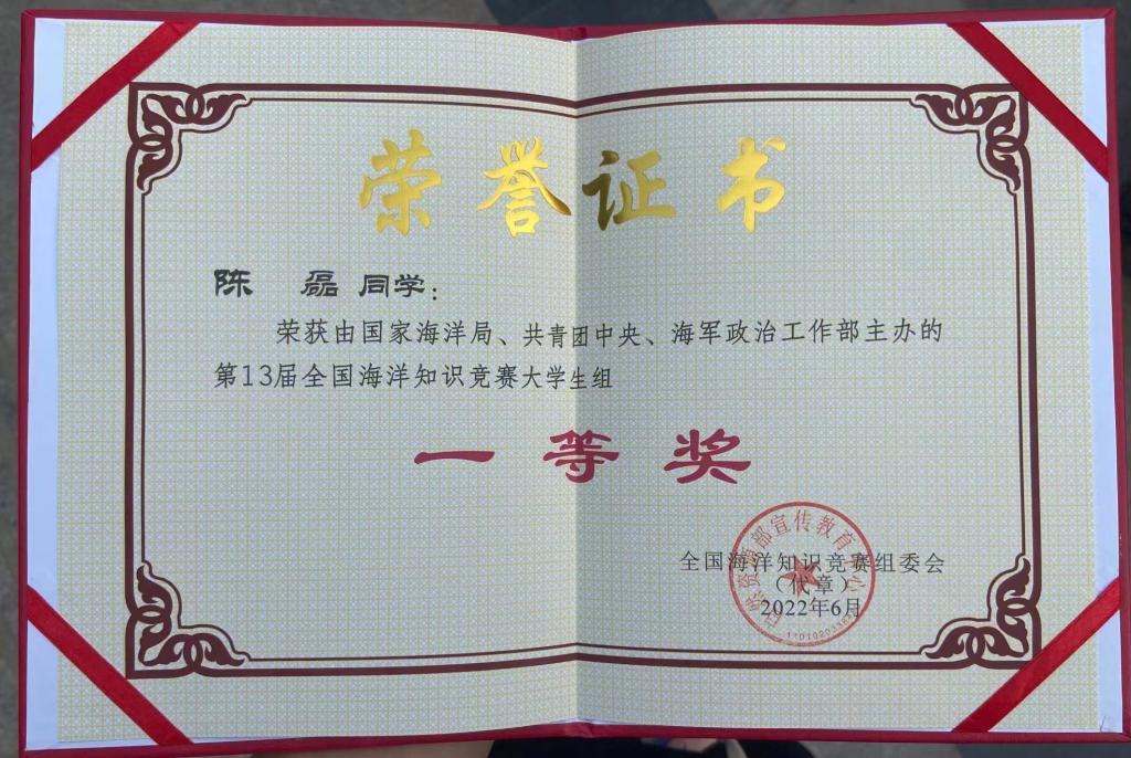 11月16日,第十三届全国海洋知识竞赛总决赛在海南省海口市举行,我院海科192班陈磊同学代表学校参加总决赛,荣获全国一等奖。