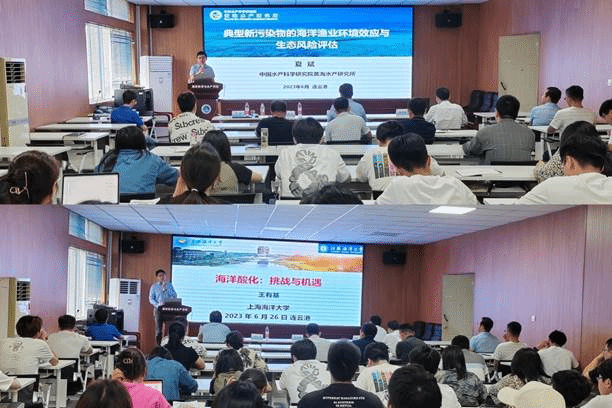 王有基教授做了题为《海洋酸化:挑战与机遇》的学术报告,围绕当前海洋酸化的世界问题,结合国家“双碳”战略,对海洋酸化对贝类的影响及其与微塑料的毒性协同效应进行了详述。夏斌研究员做了题为《典型新污染物的海洋渔业环境效应与生态风险评估》的学术报告,详述了渔业环境污染生态学团队在新污染物方面的研究进展以及对未来研究方向的展望。两位专家就生物碳汇和微塑料的生态效应等师生关心的问题进行了逐一解答,整场报告反响强烈,在座师生受益匪浅。
