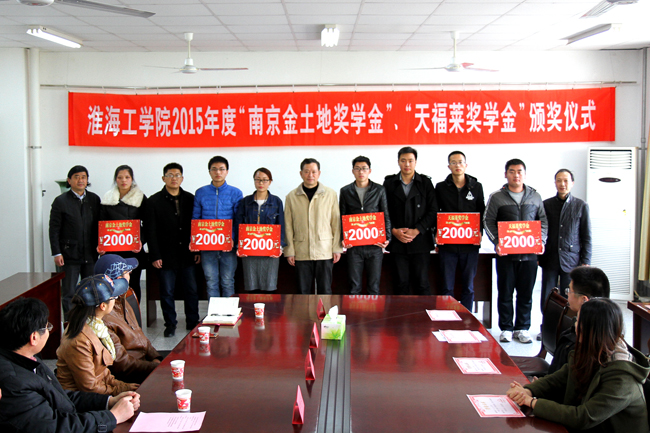 3月23日下午,淮海工学院2015年度“南京金土地奖学金”、“天福莱奖学金”颁奖仪式在海洋学院二楼会议室举行。校党委副书记、纪委书记史顺良、学生处处长汤洪涛、南京金土地生物技术有限公司副总经理唐向阳、江苏天福莱集团有限公司总裁助理王晓明、人力资源部副经理赵雪君、海洋学院党政负责人及20名获奖同学参加了颁奖仪式。海洋学院院长阎斌伦同志主持会议并致欢迎词。