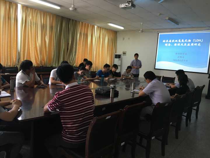 会上由海洋科学系吕明生教授和蔡月凤博士分别作了《纳米层状双氢氧化物(镁铝LDH)的制备、特性及应用研究》和《栉孔扇贝在苯并[α]芘胁迫下解毒代谢分子基础研究》的学术报告。吕明生教授与各位教师、同学交流并探讨了关于镁铝LDH的物质结构特性、合成原理、生物毒性及其开发应用等方面的研究进展。蔡月凤博士主要介绍了海洋环境中典型POPs(BaP)的解毒代谢过程、分子调控机制及其生物毒性效应研究进展以及共同关注的研究热点问题。
