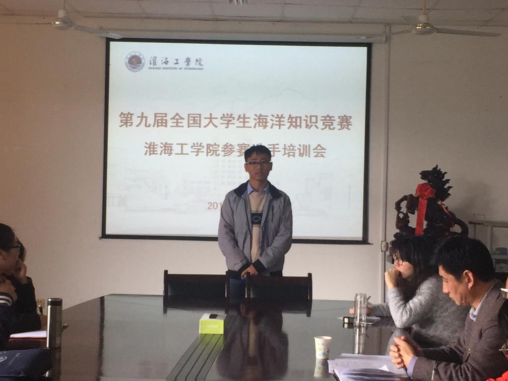为深入贯彻“建设海洋强国”和“21世纪海上丝绸之路”的战略部署,落实习近平总书记“要进一步关心海洋、认识海洋、经略海洋”的指示精神,引导青少年学习海洋知识、增强海洋意识,为实现中华民族伟大复兴而奋斗,国家海洋局、共青团中央、海军政治工作部共同主办了第九届全国大中学生海洋知识竞赛。在我校团委、学生会的大力支持下,作为丝绸之路经济带和21世纪海上丝绸之路的交汇点和“桥头堡”连云港的淮海工学院大学生代表,海洋生命与水产学院海科151班级叶琦同学参加了本次大赛并成功进入全国决赛圈。2016年10月30日上午,海洋生命与水产学院开展了第九届全国大学生海洋知识竞赛淮海工学院参赛选手培训会。学校团委郭戈老师、校学生会代表、海洋生命与水产学院团委副书记王静、海洋科学系多位教师及小企鹅海洋保护协会感兴趣的同学参加了培训会。