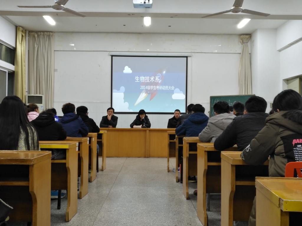 为进一步加强学风建设,帮助2014级学生尽早树立考研目标,坚定考研决心,3月13日晚七点,海洋生命与水产学院在海洋北楼308会议室召开了生物技术系2014级学生考研动员大会,学院生物技术系主任王洪斌教授、党委副书记唐瑶、班主任李士虎老师及专业辅导员参加了本次动员会议。