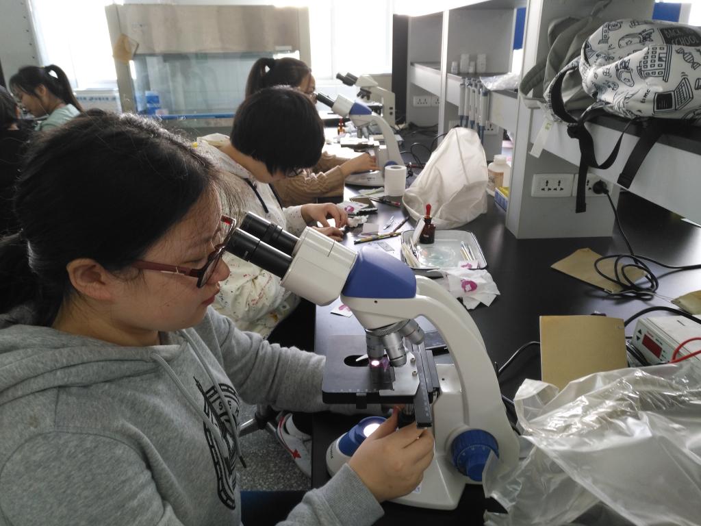 比赛一声令下,专业组的同学们便立刻进入状态,较量着大葱葱花的减数分裂实验,所有人有条不紊,举手投足中都彰显他们其不俗的显微镜使用技巧。与此同时,业余组的参赛人员在海洋北楼308学习使用光学显微镜,包括使用步骤、方法、注意事项。接着,业余组选手间的比赛开始了,选手共观察十五个切片标本,根据观察速度和质量进行评选。各位参赛选手在比赛中都表现出对微观世界好奇和兴奋,在操作显微镜时,谨慎小心,在缓缓调节出影像时,又兴奋地差点惊呼出声,虽然动作还有速度和专业组的选手相形见绌,可是他们对知识还有科技的激情却更加火热沸腾。