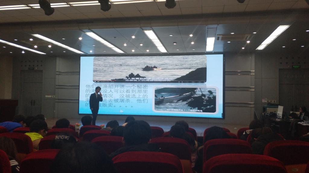 决赛分为知识问答、答辩展示两个环节。主持人为同学们介绍了比赛规则,激烈的比赛就此拉开帷幕。决赛现场,6个组别的参赛队一个个表现踊跃,现场比赛气氛甚是热烈。在座的观众在紧张的氛围中不知不觉地记忆、理解和领悟着海洋知识,“下面哪种生物是我们所指的美人鱼?”“章鱼有3个心脏啊!”“鱼有耳朵吗?”……同学们小声地交流着题目的答案。二十题的答题过程中,选手们有遗憾,有庆幸,有愉悦。接着,在第二轮比赛中,选手们以视频导入,围绕海洋开发、海洋技术、海洋污染等主题展开演讲。体育学院代表队的“海洋开发”,为大家阐述了任重道远的海洋强国建设;土木与港海学院代表对的“海洋污染”,让大家深刻反思人类的行径;海洋生命与水产学院关于“海豚杀捕”的演讲更是掷地有声,给在场师生留下了深刻的印象。
