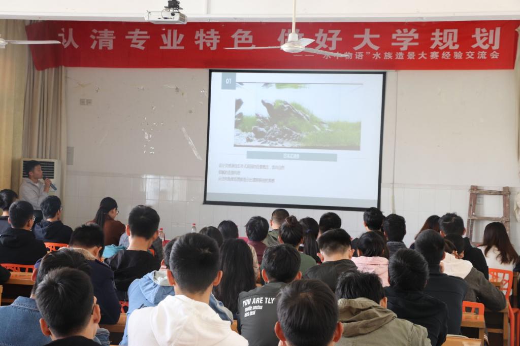 活动伊始,在第五届全国大学生水族箱造景大赛上获奖的学生代表杜鑫鑫为同学们介绍了水族造景的发展前景,并简要进行了水族箱的开缸讲解,让同学们感受到了“水中物语”的魅力;接着,参赛代表宋杰分享了本次大赛的基本情况和参赛感受;随后水产养殖系主任程汉良从养殖专业的专业设置、人才培养、专业排名、就业前景等方面,介绍了淮海工学院水产专业作为省级品牌专业在学业和就业上的优势,程老师用丰富的校友案例和详细的数据分析,让同学们了解了国内水产养殖产业技术发展和水产养殖技术人才的需求。
