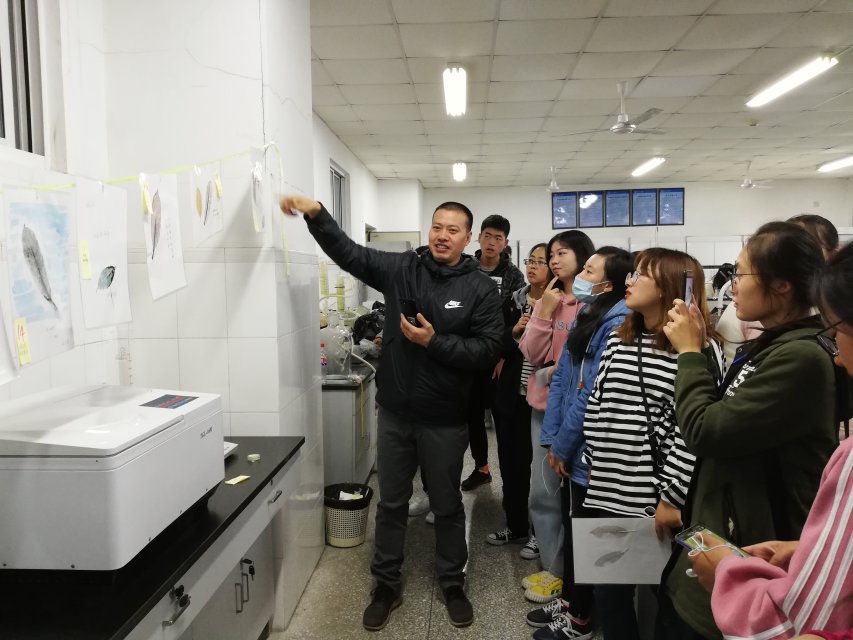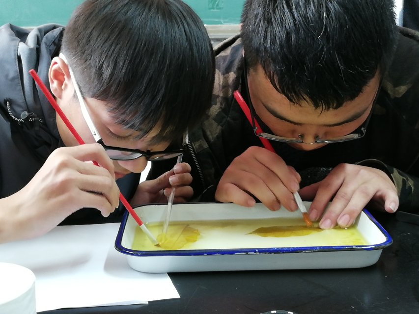 活动伊始,李士虎首先为参赛者讲述制作书签的过程——简单的分为四步:首当其要是选好叶脉粗壮而密的树叶;然后是用5%的氢氧化钠溶液煮叶片;第三步是刷掉叶肉留下叶脉;最后就是晾干染色美化后塑封。随后,王淑芳老师强调了实验室仪器的注意事项,比赛正式开始。