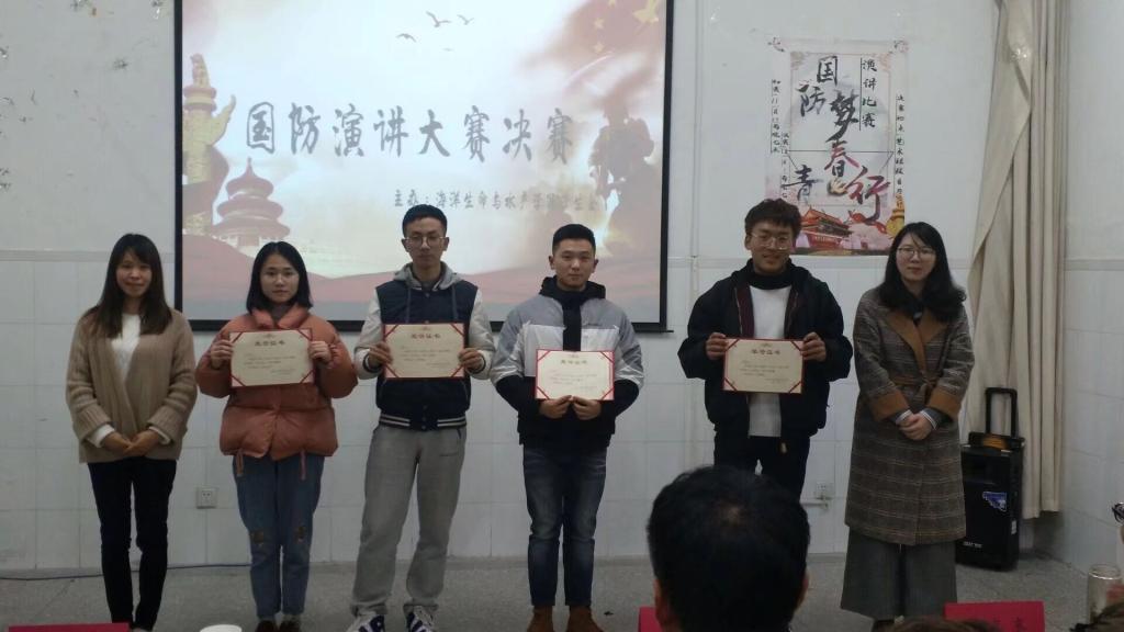 初赛阶段,来自各个学院的34名选手经过角逐、筛选,最终选出5个学院的10名选手入围决赛。“国若招,我必回”,王也同学结合自己当兵的经历,分享了他的光荣岁月以及对国防的拥护,令人深受鼓舞。常俊宇同学通过讲述身边的小事,表达了“与其纠结于身边的小摩擦,还不如树起斗志,保家卫国”,使全场热血沸腾。谭诗艳同学,通过讲述内蒙古一对夫妻守卫边疆的故事,来赞颂“小人物”的平凡与伟大。选手们从历史追溯到近代发展,从国防的定义讲到国防的意义,娓娓道来。他们的拳拳赤子心,洋溢着青春与自信。决赛后,李联泰老师有感而发,用一曲激昂的军旅歌曲点燃现场,也深深感染了在场的每一位同学。最后,经过评审,测绘与海洋信息学院王醇营获得一等奖,海洋生命与水产学院卫福兰、周洳伊获得二等奖,外国语学院谭诗艳、海洋生命与水产学院王也、周慧敏获得三等奖,其余同学获得优秀奖。
