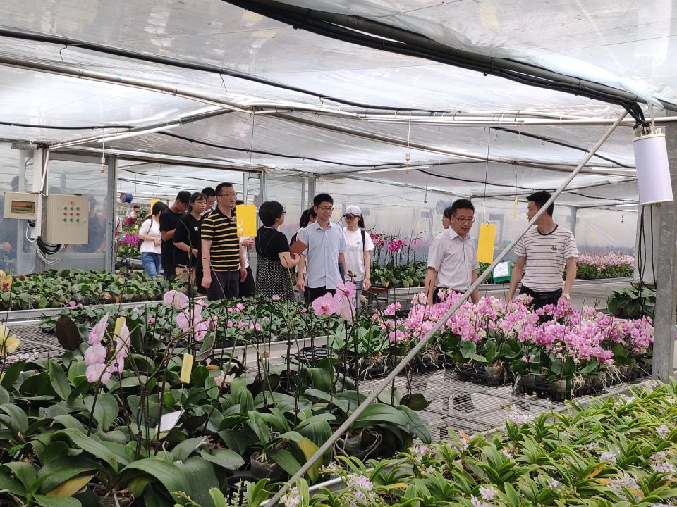 仪式结束后,暑期实践小组成员来到花卉养殖基地参观蝴蝶兰养殖大棚。生产部负责人岳经理介绍到:“目前,大棚主要培养迷你蝴蝶兰和年销蝴蝶兰,基地根据市场需求来调整蝴蝶兰的花期;工作中,蝴蝶兰在培养时要进行病毒检测,检测技术的创新和高效是基地遇到的一个瓶颈,急需专业人才来研究。” 在岳老师的带领下,实践队员们学习了解蝴蝶兰染色的养殖原理、切花技术等。