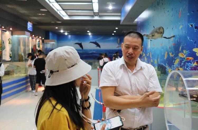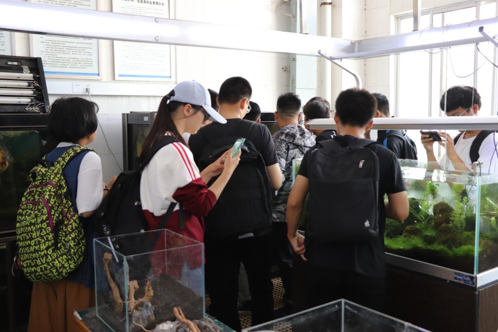 校海洋馆内丰富多彩的鱼类展示台,吸引着新同学们驻足观看。同学们在班助的带领下,近距离地欣赏海洋生物。讲解员们结合自身专业,把各种海洋生物的习性、特点等知识形象生动地介绍给每个学生,并以问题的形式引导新生进行思考、讨论。同学们既加深了对各种生物学科的了解,也开阔了视野。