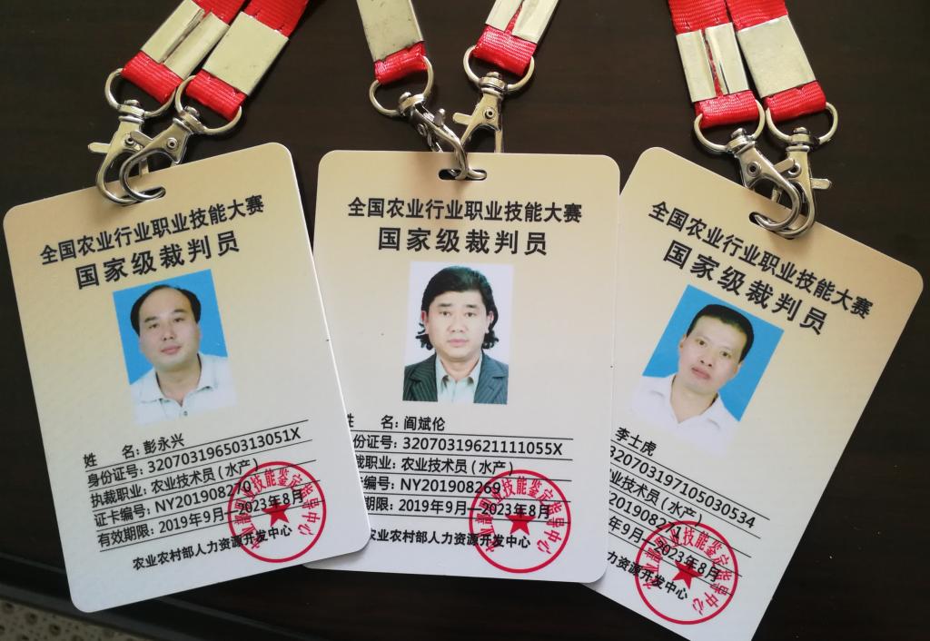 国家农业农村部人力资源开发中心文件:农人力(鉴定)发〔2019〕7号文件,根据《国家职业技能竞赛技术规程(试行)》《国家级职业技能竞赛裁判员管理办法(试行)》和全国农业行业职业技能大赛的有关要求,经考核合格,2019年阎斌伦等 430名同志取得全国农业行业职业技能大赛国家裁判员资格,纳入全国农业行业职业技能大赛裁判员库,颁发《全国农业行业职业技能大赛国家级裁判员证卡》。本次参加培训的水产类裁判员共90名,我校阎斌伦、彭永兴、李士虎3老师以前是国家职业技能鉴定高级考评员,本次参加全国职业技能大赛国家级裁判员培训全部通过考核,获得国家级裁判员证卡。