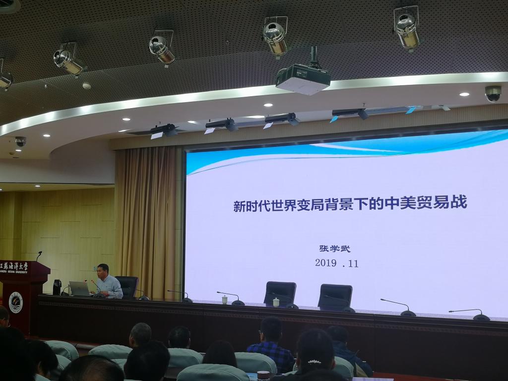 讲座中,张学武书记首先从“为什么会发生中美贸易战”和“如何看待中美贸易战”两个角度,阐述了当前社会舆论下大众所认为的中美贸易战的起因与现状,并分析了起因中“中国高调论”、“妥协投降论”和“全面对抗论”的片面性,主张大家从新时代的历史维度和世界变局的现实维度来看待中美贸易战。接着,张学武书记结合影响新时代世界大局的八个变量,分析了中美爆发贸易争端的背景和动因。然后,张学武书记对中美贸易争端可能出现的四个发展方向作出了展望,并提出了解决中美贸易争端的中国对策。最后,张学武书记表示在以习近平同志为核心的党中央的坚强领导下,发挥社会主义制度的优势,全国上下戮力同心,我们一定能够迈过中美贸易争端乃至整个中美关系这道坎。