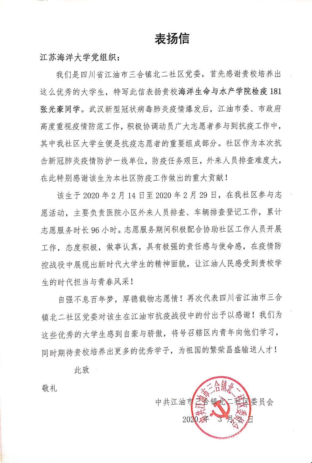 鉴于张光豪同学的优异表现,江油市三合镇北二社区特向我校寄来表扬信,全文如下: