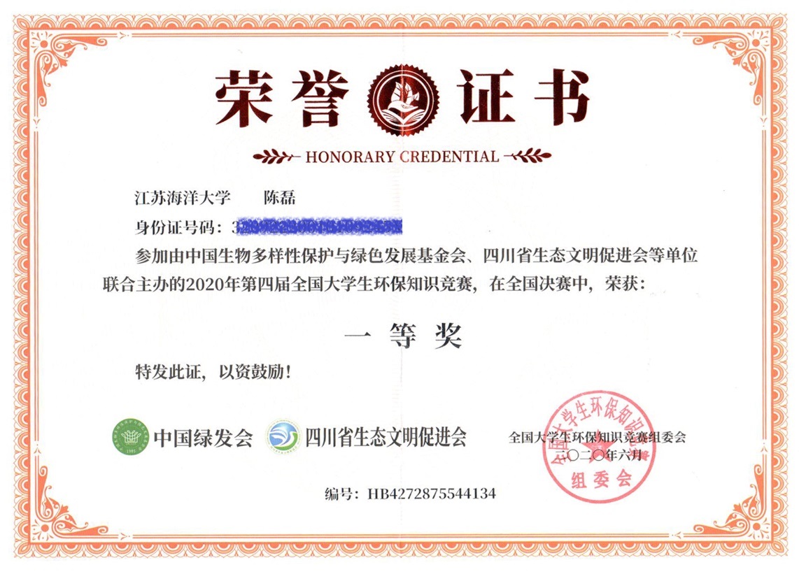 近日,由中国生物多样性保护与绿色发展基金会、四川省生态文明促进会联合主办,我爱竞赛网、中国绿发会大学生工作委员会承办的第四届全国大学生环保知识竞赛圆满结束。该赛事由我爱竞赛网和四川省生态文明促进会自2017年发起举办,致力于环保知识的宣传,大学生环境保护意识的培养,目前已成功举办四届,累计近六百万大学生参与,一千多所高校团委社团组织协办,深受全国各高校老师和学生的支持和关注。经过全国初赛和决赛,由我院姬南京博士指导的海洋科学专业学生陈磊获得一等奖。