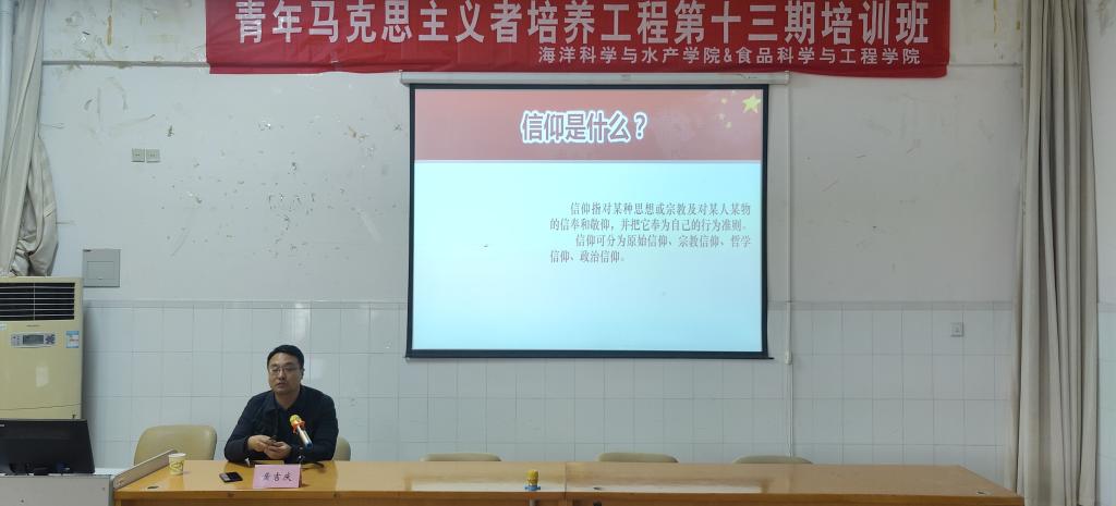 11月28日下午,海洋科学与水产学院第十三期“青马工程”之与青年人谈信仰专题讲座在海洋北楼308室顺利举办。校团委副书记黄吉庆作为主讲嘉宾为海院及食品院全体青马学员讲了一堂生动的思政课。