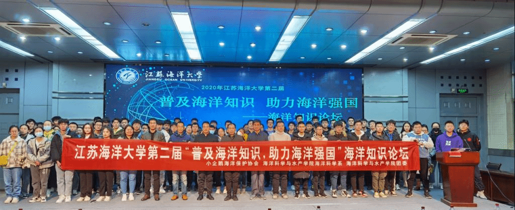 2020年11月29日下午,江苏海洋大学第二届“普及海洋知识,助力海洋强国”海洋知识论坛在我校苍梧校区艺术楼报告厅举办,海洋科学与水产学院党委王波书记、张根友副书记,海洋科学系暴增海、李联泰、许星鸿、冯志华教授,蔡月凤、王攀攀博士以及海科182于世豪同学应邀参加活动。本次论坛由小企鹅海洋保护协会和海洋科学与水产学院海洋科学系主办,海洋科学与水产学院团委协办,海洋科学系海科201、202、海环201班级和来自全校的近300名学生现场参加了本次论坛,全校有近900名学生线上参与了本次活动。