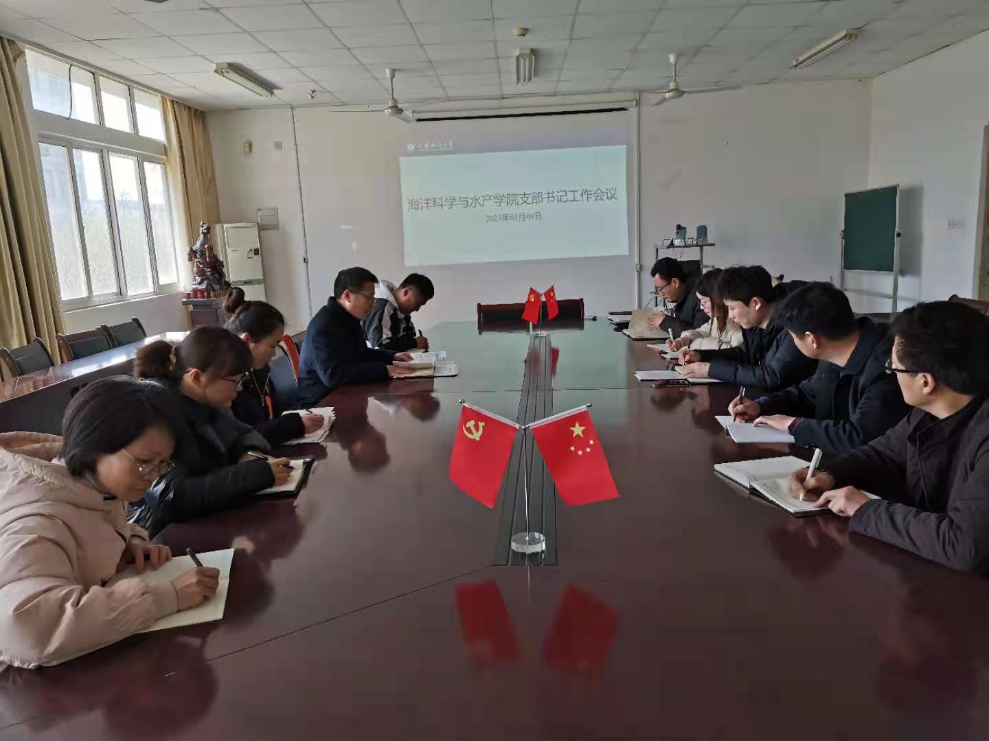 张根友首先传达了校党委书记王自力在党务工作会议和意识形态工作会议上的讲话精神,结合2021年学校党政工作要点,对学院上半年党建工作进行了布置,要求进一步推进党支部标准化、规范化建设;严格落实全面从严治党责任清单,做好网上履职平台填报工作;进一步优化党支部设置,加强样板支部创建工作,积极培育特色党支部;积极开展主题党日活动,推动党支部建设创新。党政办主任张利民解读了《海洋科学与水产学院党支部建设工作目标及考核办法》。各支部书记就如何做好下一步工作进行了深入交流和探讨。会上组织学习了《中国共产党统一战线工作条例》,对落实好统战工作进行了安排。