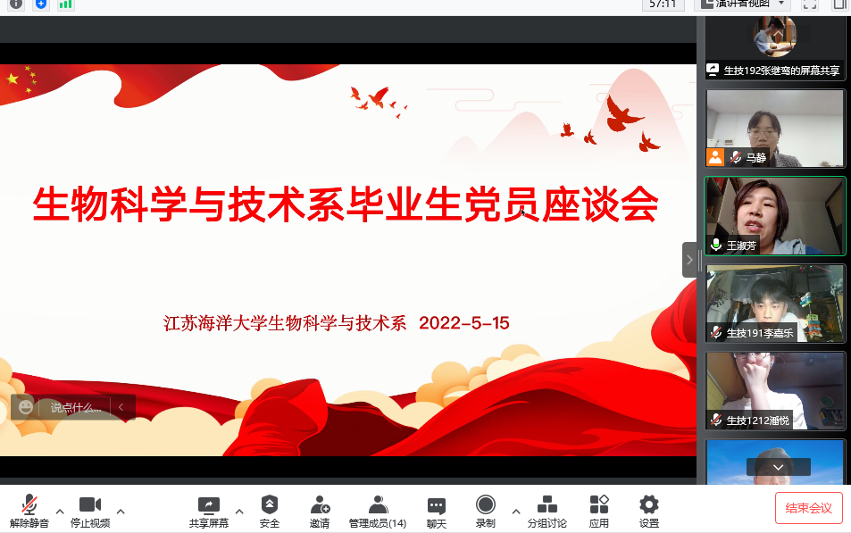 为进一步加强毕业生党员的教育管理,发挥毕业生党员在毕业设计、就业、文明离校等各项工作中的先锋模范作用,深入推进 “我为群众办实事”实践活动。5月15日下午16:30,海洋科学与水产学院生物科学与技术系毕业生党员座谈会于线上召开。出席本次会议的有生技系教师党支部书记马静、系主任王淑芳、毕业生党员代表以及非毕业生党员代表。