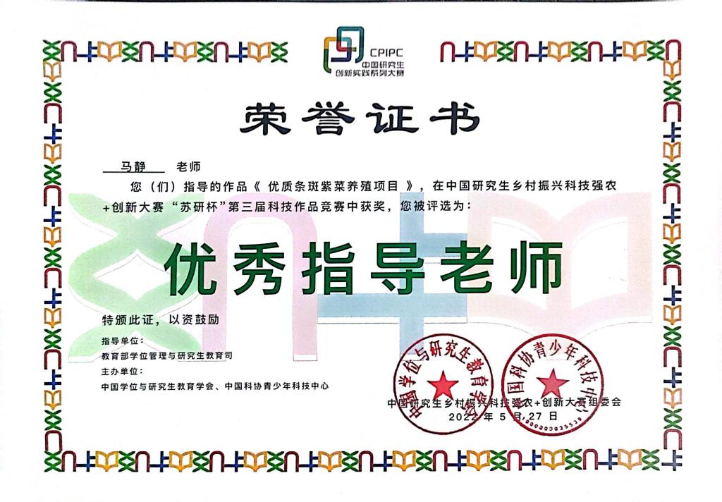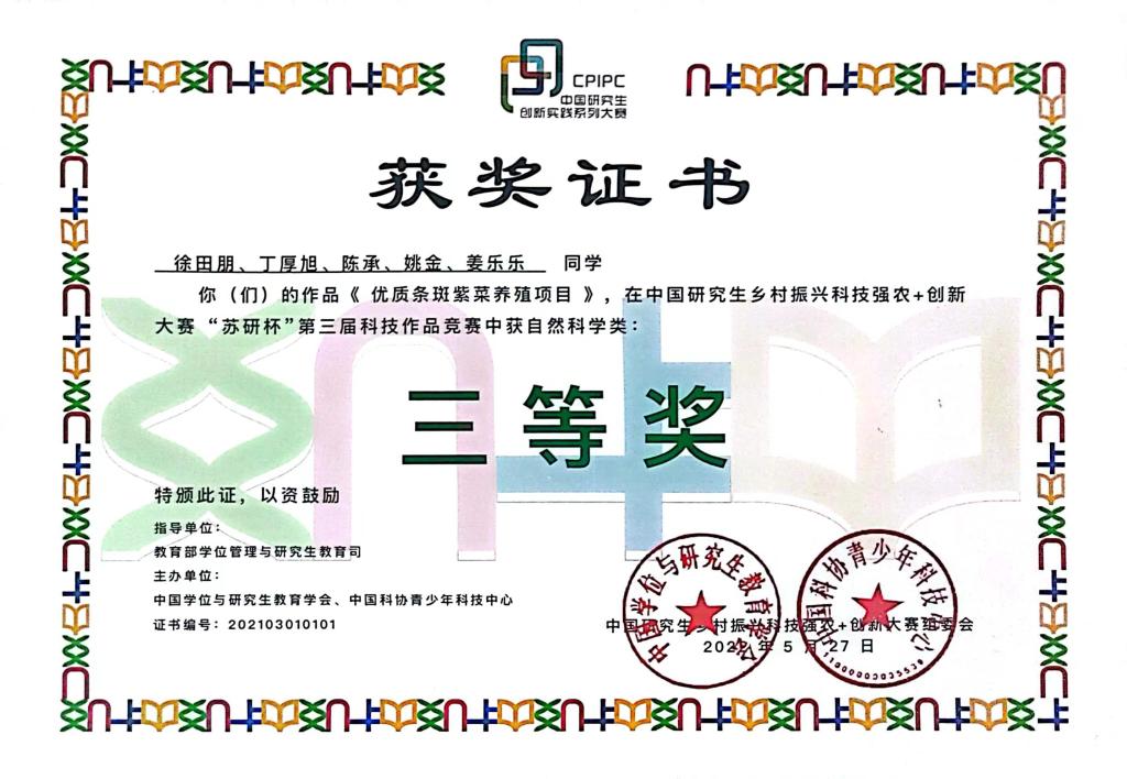 5月20日,中国研究生创新实践系列大赛——乡村振兴科技强农+创新大赛 “苏研杯”第三届科技作品决赛在浙江农林大学举行,我院选送的徐田朋、丁厚旭等同学的作品《优质条斑紫菜养殖项目》荣获三等奖,学院马静副教授、王洪斌教授荣获“优秀指导教师”。