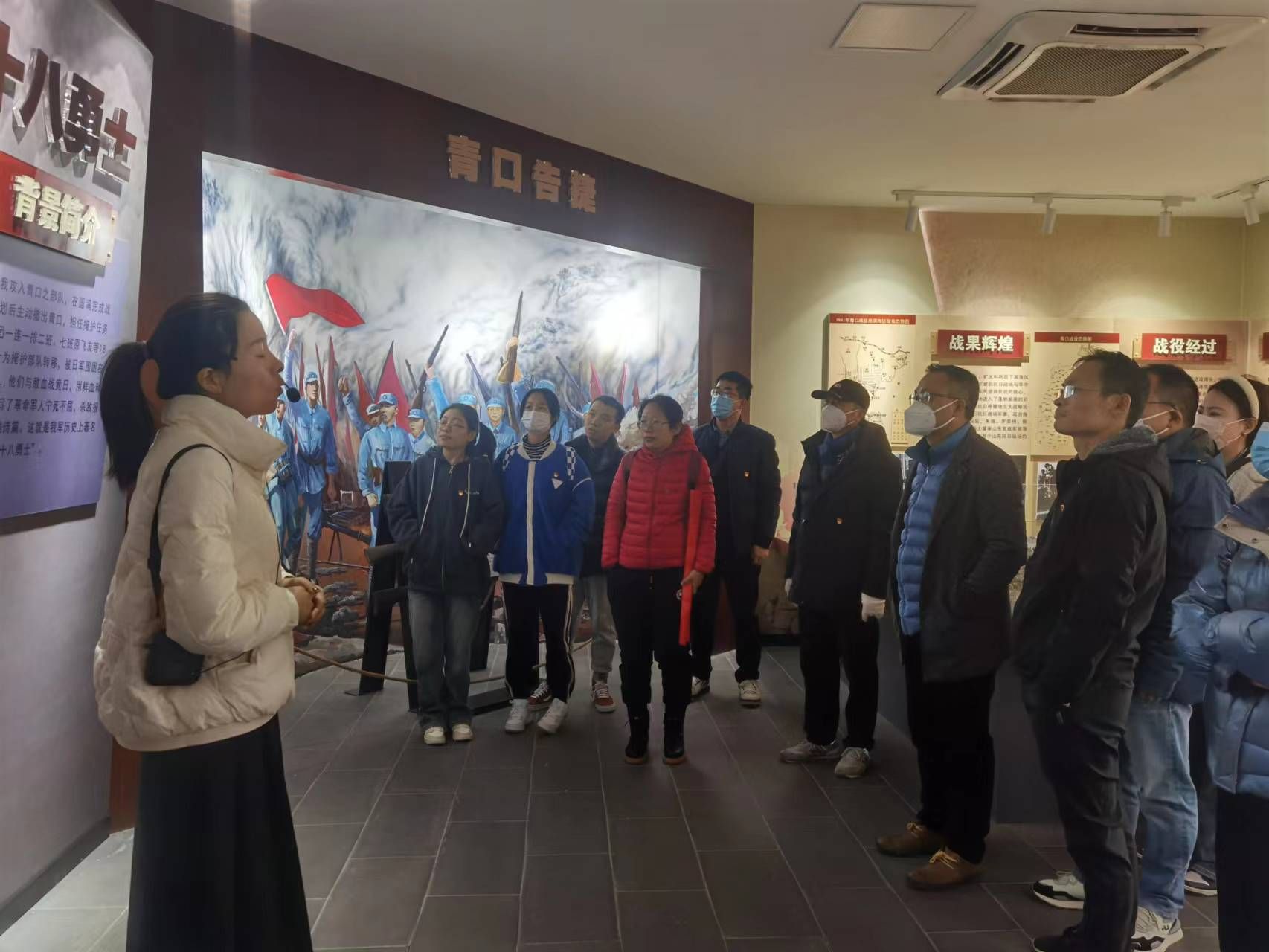 在青口十八勇士纪念馆,讲解员讲述着18位英雄的壮丽篇章,“青口十八勇士的荣誉战旗曾在纪念中国人民抗日战争暨世界反法西斯战争胜利七十周年阅兵式上,由受阅部队将士高高擎起……”,大家认真聆听红色故事,共同缅怀革命先烈,追忆“青口十八勇士”面对强敌不屈不挠、壮烈牺牲的英雄事迹。
