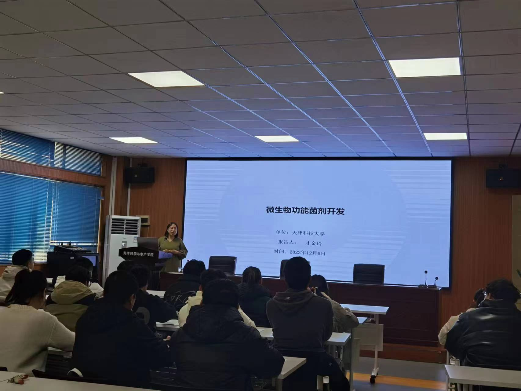 12月6日下午,天津科技大学才金玲研究员应邀到我院交流,并作题为《微生物功能菌剂开发》的学术报告。报告会由高焕副院长主持,海洋科学与水产学院的50余名师生参加了报告会。