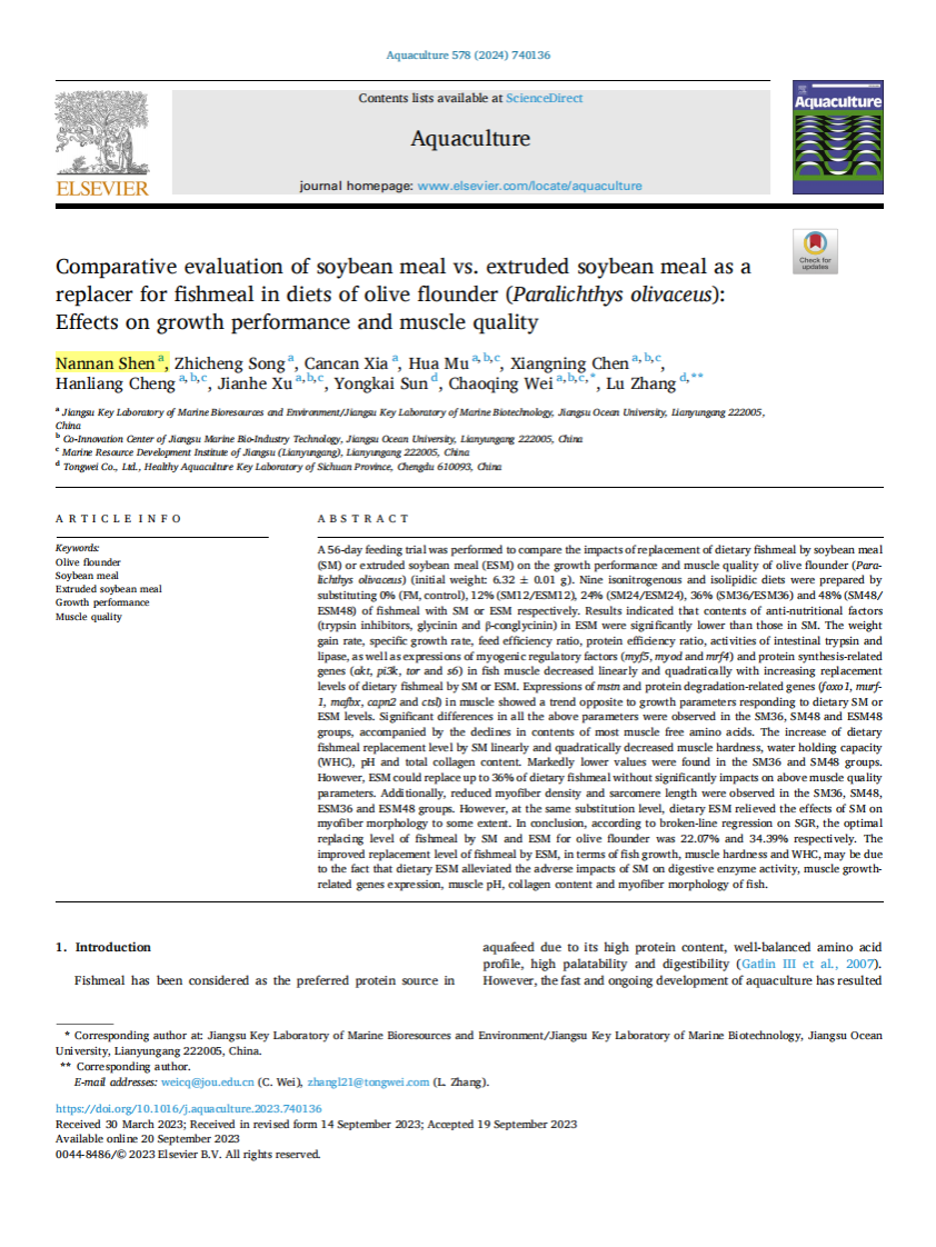 近日,海洋科学与水产学院水产养殖学专业本科生沈南南在鱼粉替代研究领域取得重要进展。研究成果以“Comparative evaluation of soybean meal vs. extruded soybean meal as a replacer for fishmeal in diets of olive flounder (Paralichthys olivaceus): Effects on growth performance and muscle quality”为题发表在水产领域期刊《Aquaculture》(中科院一区Top期刊)。水产养殖学专业本科生沈南南为第一作者,海洋科学与水产学院教师魏朝青和通威股份副总裁、通威研究院副院长张璐研究员为论文的通讯作者。该研究工作得到了江苏省优势学科、江苏高校自然科学基金、江苏省海洋生物技术重点实验室开放课题等项目的资助。