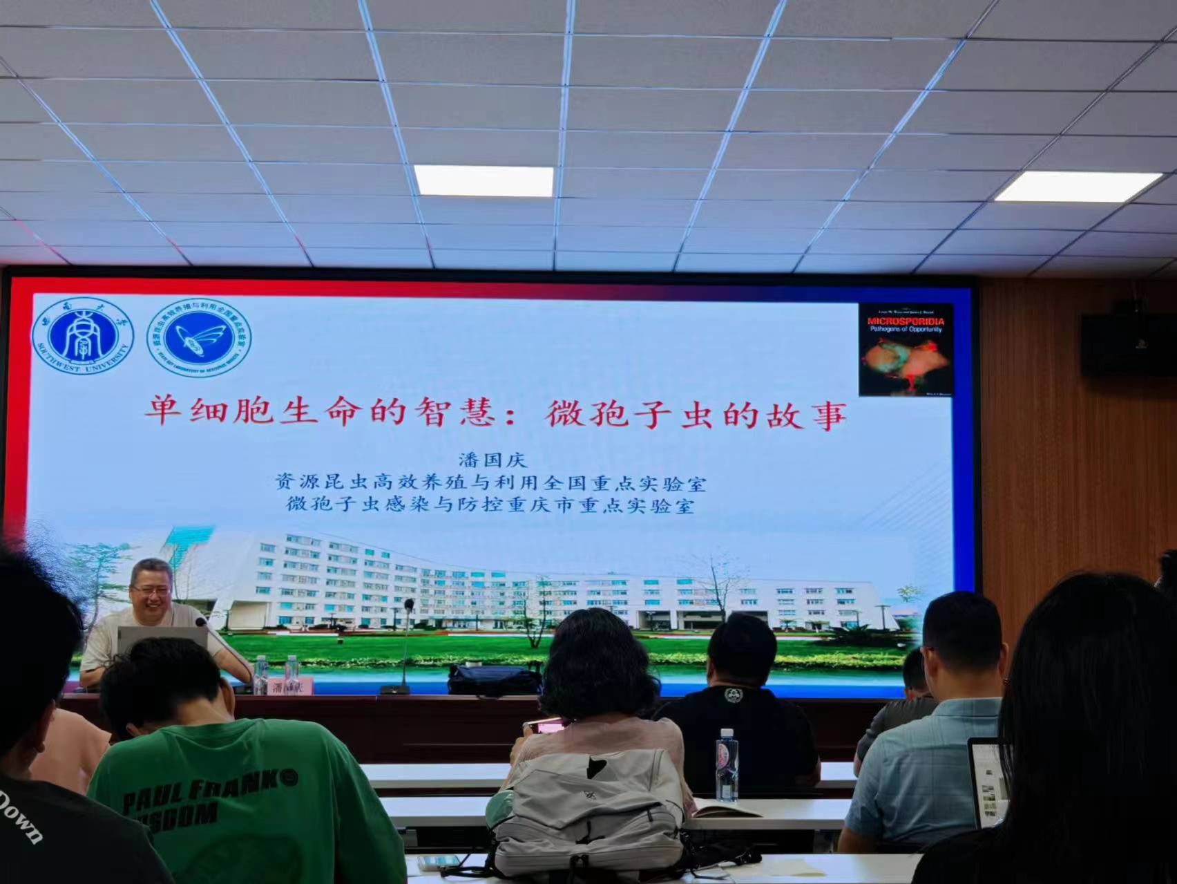 报告会上潘国庆教授站在生命起源和演化意义的哲学高度阐释了生命的价值和意义,并以微孢子虫繁殖发育的策略为主题,详细阐述了他们课题组30多年来在微孢子虫研究上获得的成果。报告引起了师生的共鸣,报告会结束后,师生还一直围着潘国庆教授就微孢子虫分类、感染机制、防治措施等问题进行了热烈的讨论。
