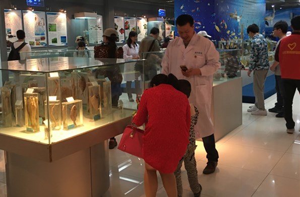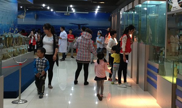 连云港恒星特殊儿童益智园是连云港市首家为特殊儿童进行康复训练及学前教育的民办机构,为迎接这群特殊的客人到海洋馆参观,5月18日下午,支部全体成员统一作工作服,配带党徽提前在海洋馆等候。当志愿者把益智园的儿童和家长带到海洋馆后,大家分头迎接,并为小观众进行海洋生物知识讲解,他们重点介绍了我国一级保护鱼类中华鲟的生长、发育、生殖洄游等习性,大闸蟹的生长、发育及与中华鲟相反的生殖洄游。党员叔叔们生动幽默的讲解引起小观众的极大兴趣,当介绍海龙、海马虽不叫鱼,但都是真实的鱼类且是“爸爸”们“怀胎”育儿时,引起阵阵笑声。