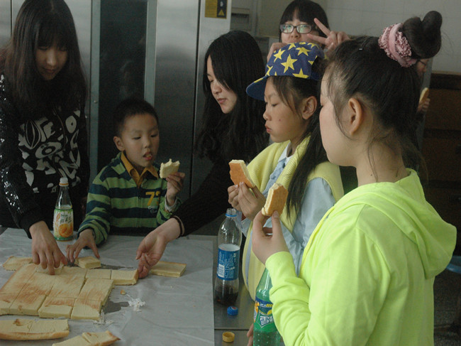 为了给向阳小学的小朋友们带去快乐和温暖,让孩子们了解面包制作和体验自己动手制作面包的乐趣,2015年4月25日,海洋学院青协邀请向阳小学的五名小学生及其家长来参加面包制作大赛。