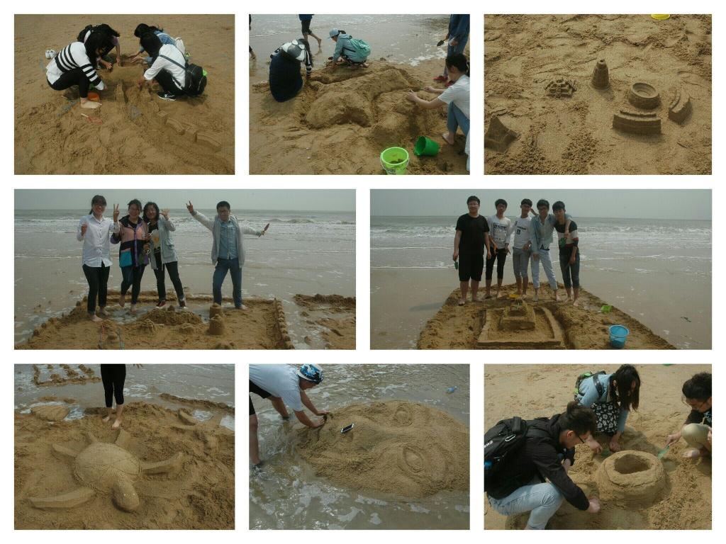 刚到在海边,大家便感受到大海的热情,明媚的阳光,清新的海风,一卷卷白色的海花此起彼伏……选手们都跃跃欲试。主持人一声号令,选手们大胆的创新与无限的灵感便涌动于指尖,大家紧锣密鼓地展开自己的创想。药学院的绍露同学带领他们的小组用细软的沙子建筑精巧的城堡。细小的沙子在他们的手上经过魔术般的变幻成为布局新颖、城墙牢固的城堡;测绘学院的参赛选手在金黄色的沙子上惟妙惟肖地画出科比肖像,表达了他们对科比的深情告别;化工学院参赛小组则用沙子建成埃及金字塔的模型,塔上的层层台阶寄托了他们对未来的美好憧憬;海洋学院的“海洋世界”里遨游着可爱的海龟、海豚,还有贝壳和海星……一组组的参赛作品让人惊喜不断,为连岛风景区增添了一道靓丽的风景线。