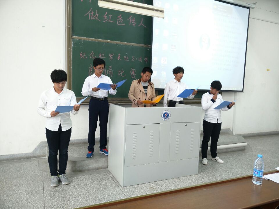 10月26日下午2点,海洋生命与水产学院“纪念红军长征八十周年”朗诵比赛在A楼201室举行。参赛评委有辅导员王静、陶亚楠,优秀学生代表段凯威、陈雨露等人,参赛选手是我院各班级的学生代表。