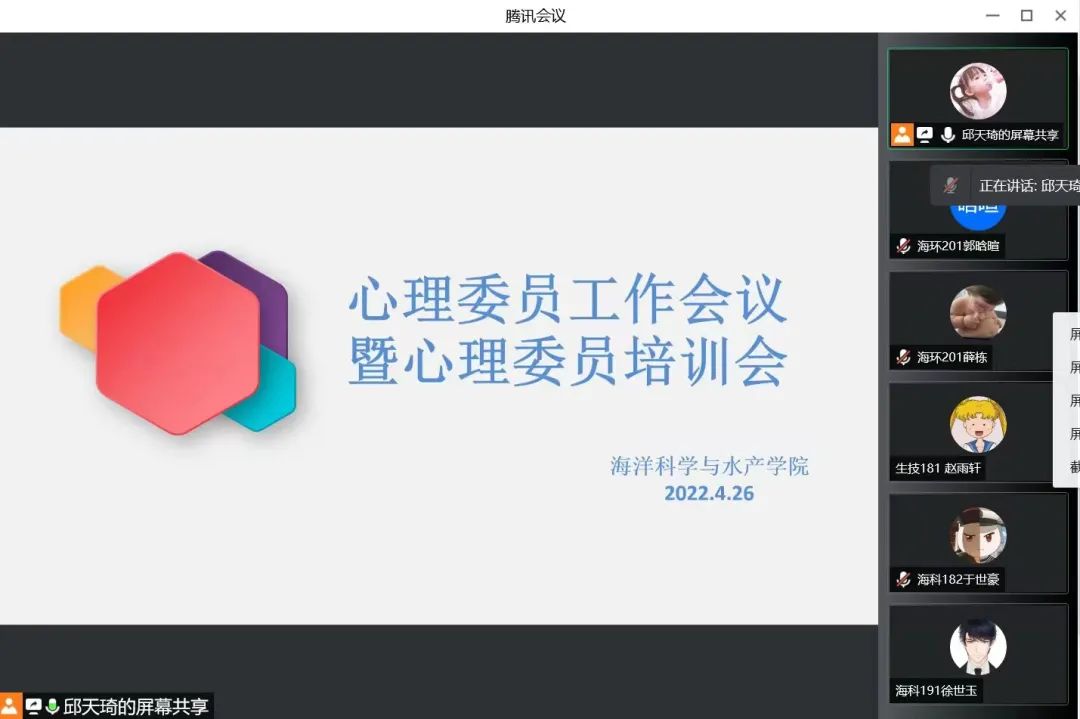 会议最后,邱天琦结合学院学生所处实际,针对2018级学生,重点关注考研失利及学业就业困难情况;对于2019、2020级学生,重点关注对于未来的迷茫及疫情期间的焦虑的情绪,并在会议上向心理委员介绍疫情期间调适情绪的方法。