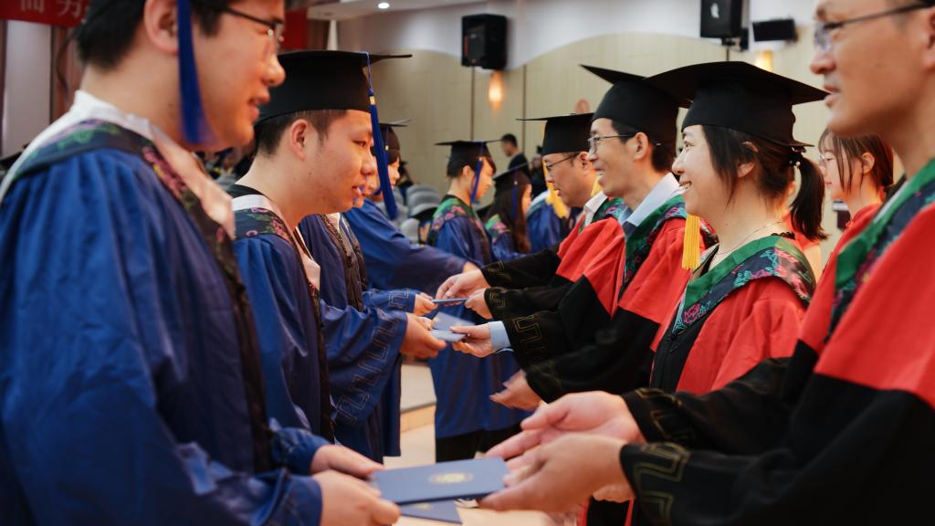 最后,院领导和学位委员会委员为毕业生们颁发学位证书并正冠拨穗、合影留念。毕业典礼在激昂的校歌声中圆满结束。