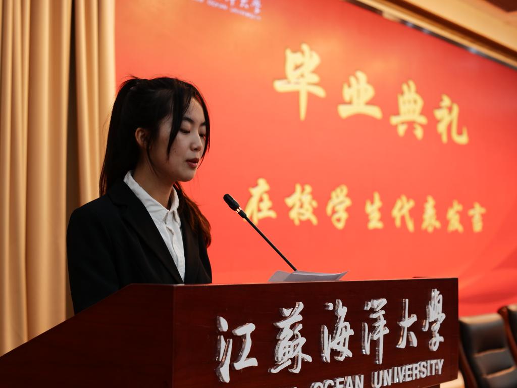 学生代表吴雨晨、陈祥顺以及董欣雨三位同学分别进行发言。吴雨晨代表全体研究生毕业生感谢母校的辛勤培育,表示将时刻铭记校训,为社会贡献自己的青春力量。陈祥顺代表全体本科毕业生感谢老师们的谆谆教诲,并表示无论走到哪里都是江海大人,都会和江海大永远在一起。董欣雨代表全体在校学生,向即将离开母校、奔赴人生远大目标的毕业学长学姐们表达最衷心的问候与祝福。