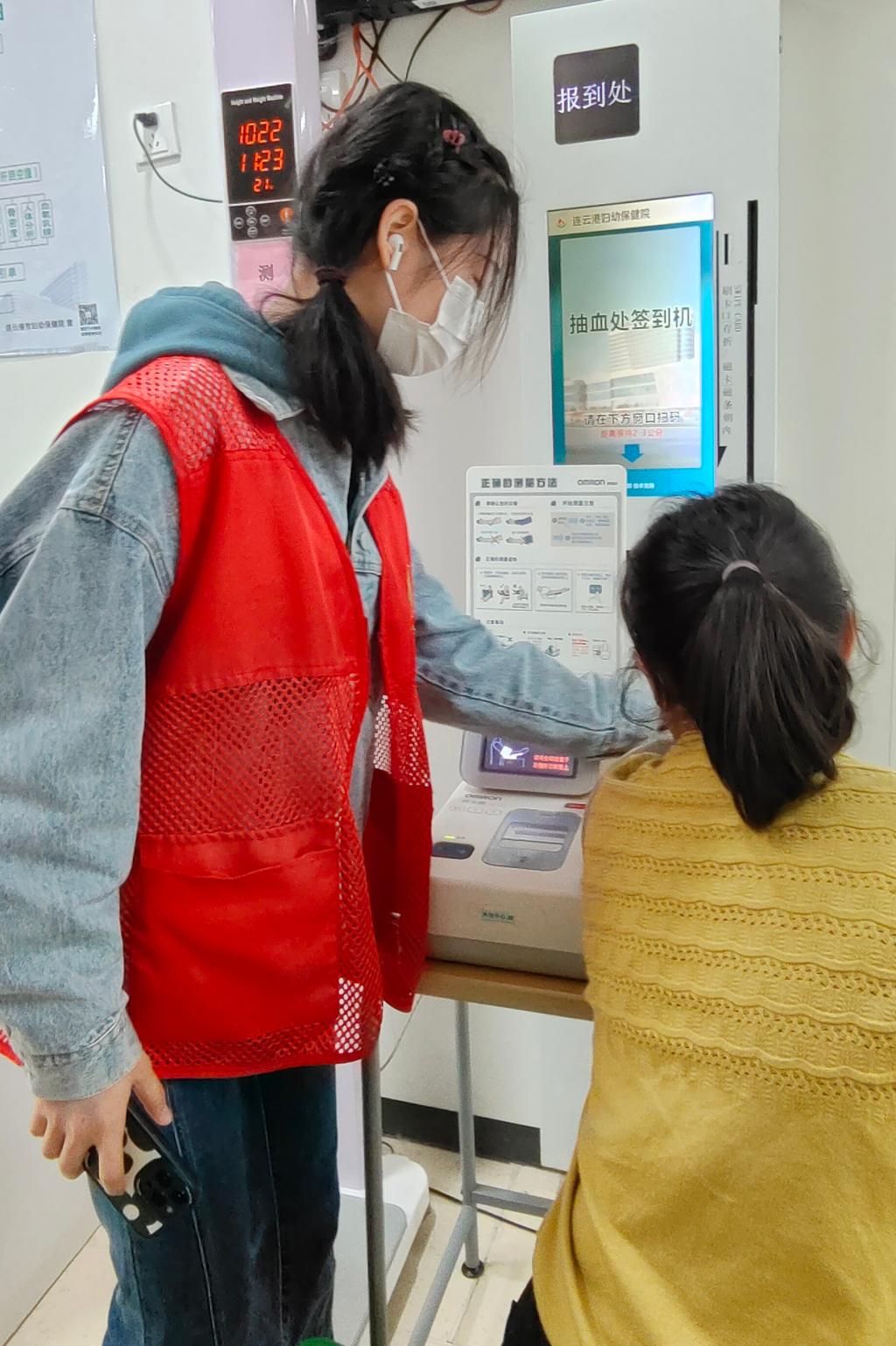 活动过程中,志愿者们佩戴口罩及医用头套在儿科室、妇科产科室、放射科室、保健科室等科室外帮助病人挂号缴费,在体检中心辅助就诊人员用测量仪测量身高体重血压等各项健康指标,在医院门诊大厅对进入医院人员测量体温、查验健康码及行程码等信息,回答就诊人员关于挂号缴费、科室分布及行进路线等方面问题咨询。