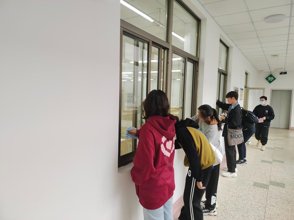 线下活动中,全体志愿者分为8组,每组10人,在组长的带领下进入所属的楼层,分工明确,合作默契,大家自带抹布,积极踊跃,不畏脏、不怕累,井然有序、认真仔细地擦拭着图书室及自习室玻璃并且维持着图书馆安静的学习环境,轻声细语,放缓脚步,充分体现了同学们的奉献热情和蓬勃朝气,将志愿者精神融入到实际行动中。