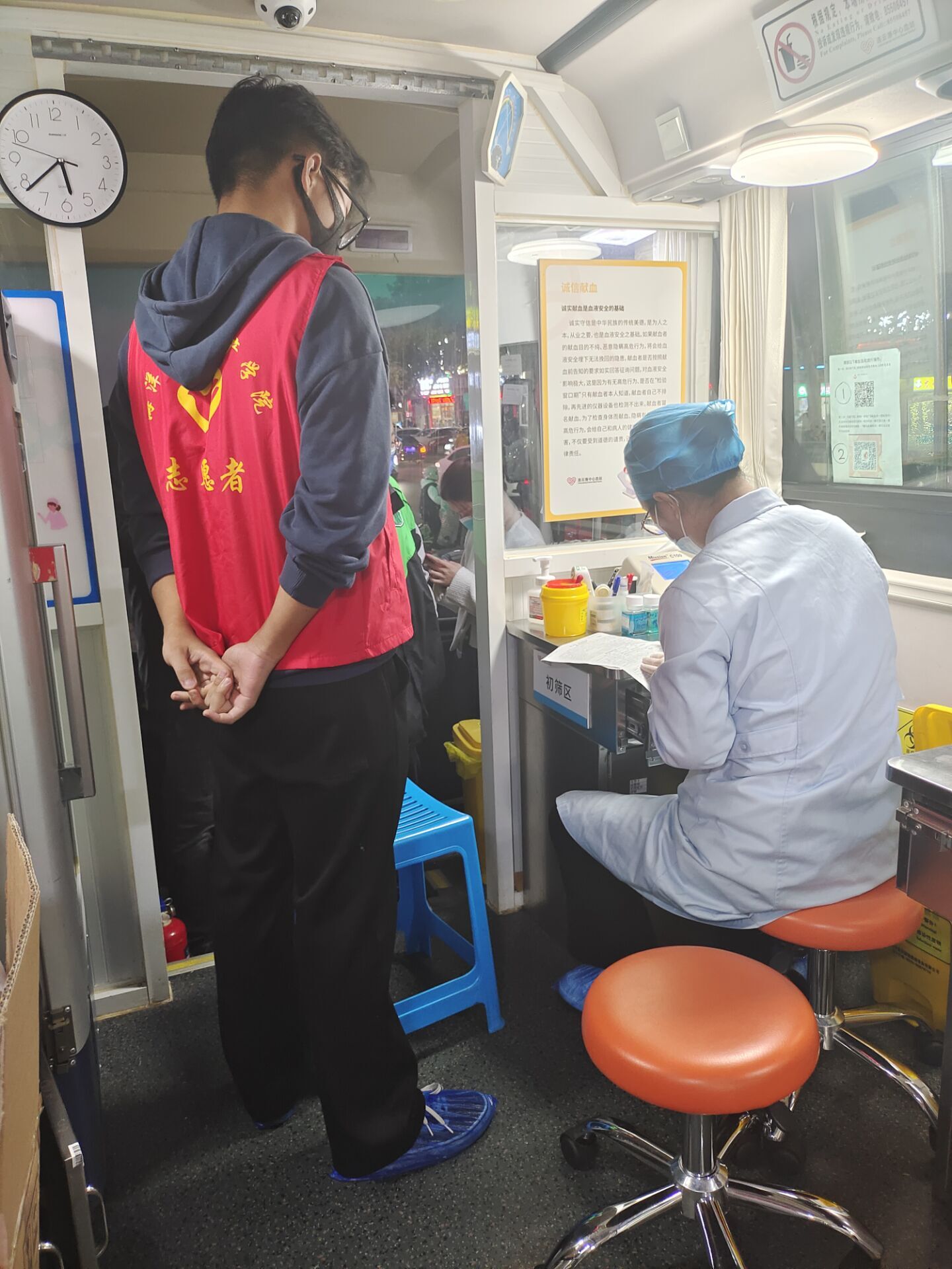 10月22日17时,志愿者服务中心志愿者前往连云港盐河巷协助献血站盐河巷献血车开展献血工作。