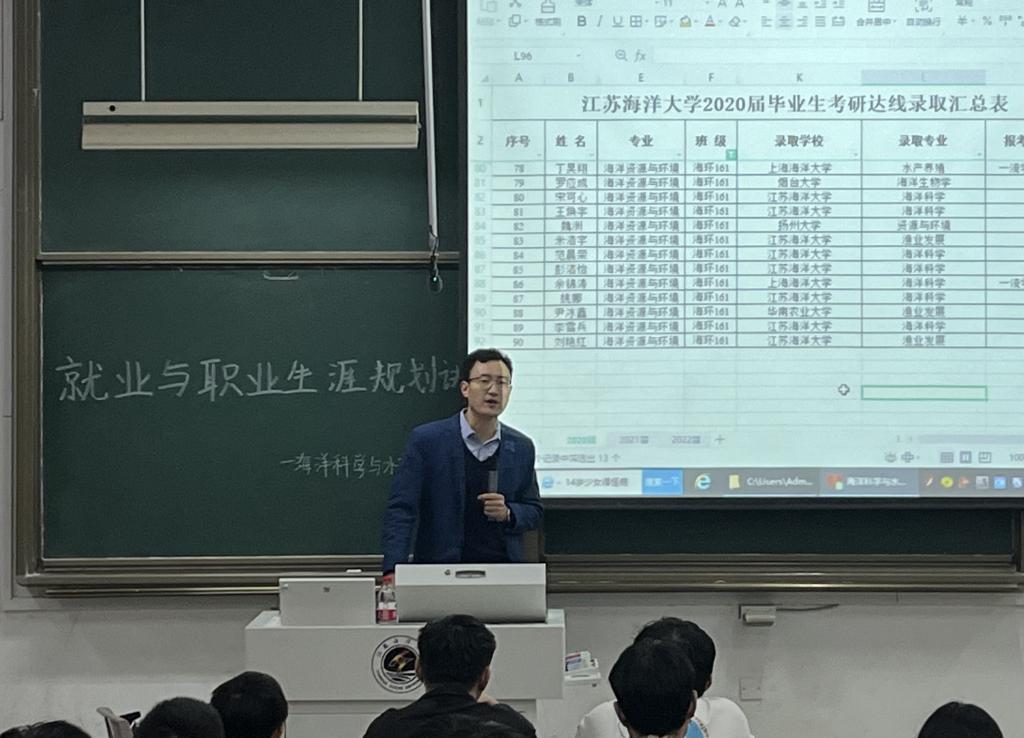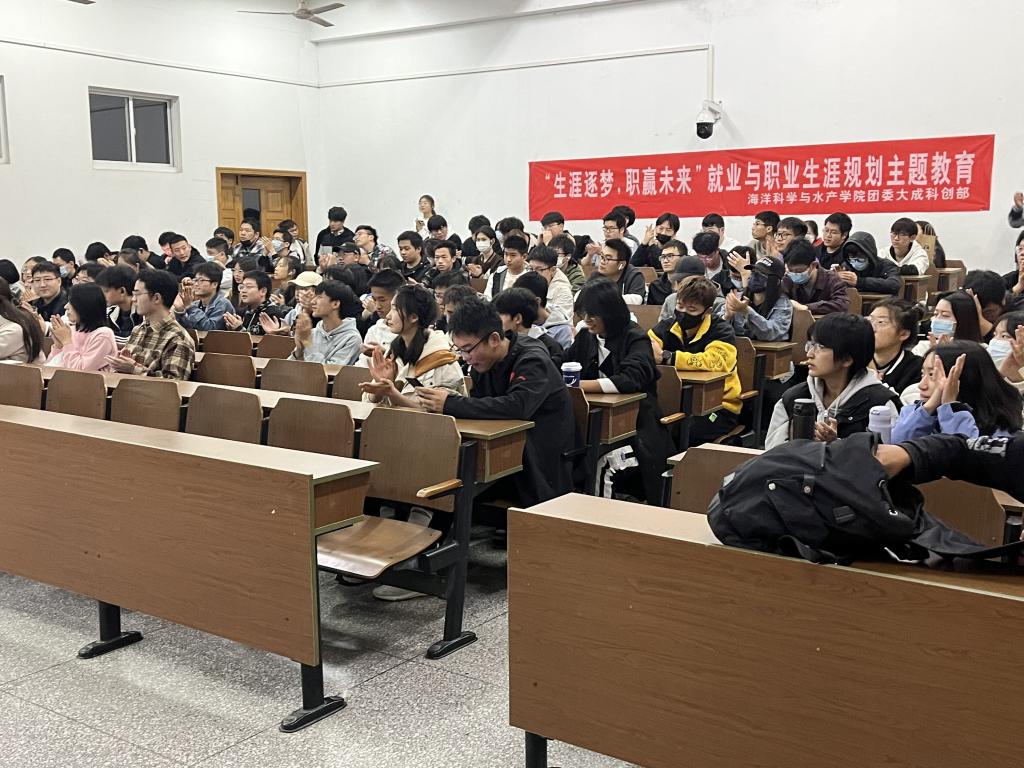 活动伊始,唐振新针对海洋科学、水产养殖、生物技术等专业建设情况进行简要剖析,他结合自己的亲身经历以及我校往年学生考研情况提出了自己的看法和见解,帮助学生适应就业形势、转变就业观念、增强择业意识、提升就业能力。他剖析了相关专业的巨大发展前景,阐释了国家对相关领域人才的巨大需求,强调在校学习要珍惜每一节课堂教学,成就最好的自己。