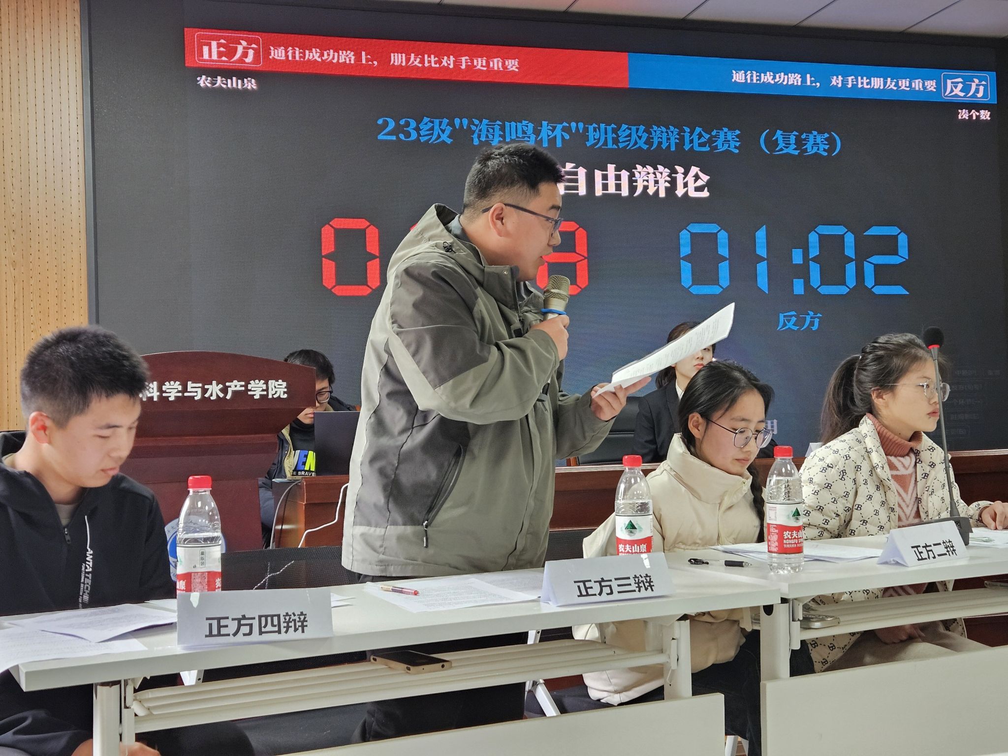 本场比赛由来自海洋科学与水产学院的4个班级代表队参加。各代表队抽签分为两个小组进行激烈的角逐,就“通往成功路上,朋友和对手谁更重要”这一辩题进行激烈讨论。在比赛开始前,主持人就比赛规则进行了耐心介绍,明确赛场纪律。随后,辩论赛场上,选手们热情洋溢、激烈雄辩。每位选手都准备充分,在辩论中展示了严谨的逻辑思维和出色的口才,问答间思维火花碰撞。在辩论的最后阶段,选手们总结自己的观点,再次用精炼的语言强调自己的立场。他们的辩论充满激情和智慧,展示了辩论的魅力。