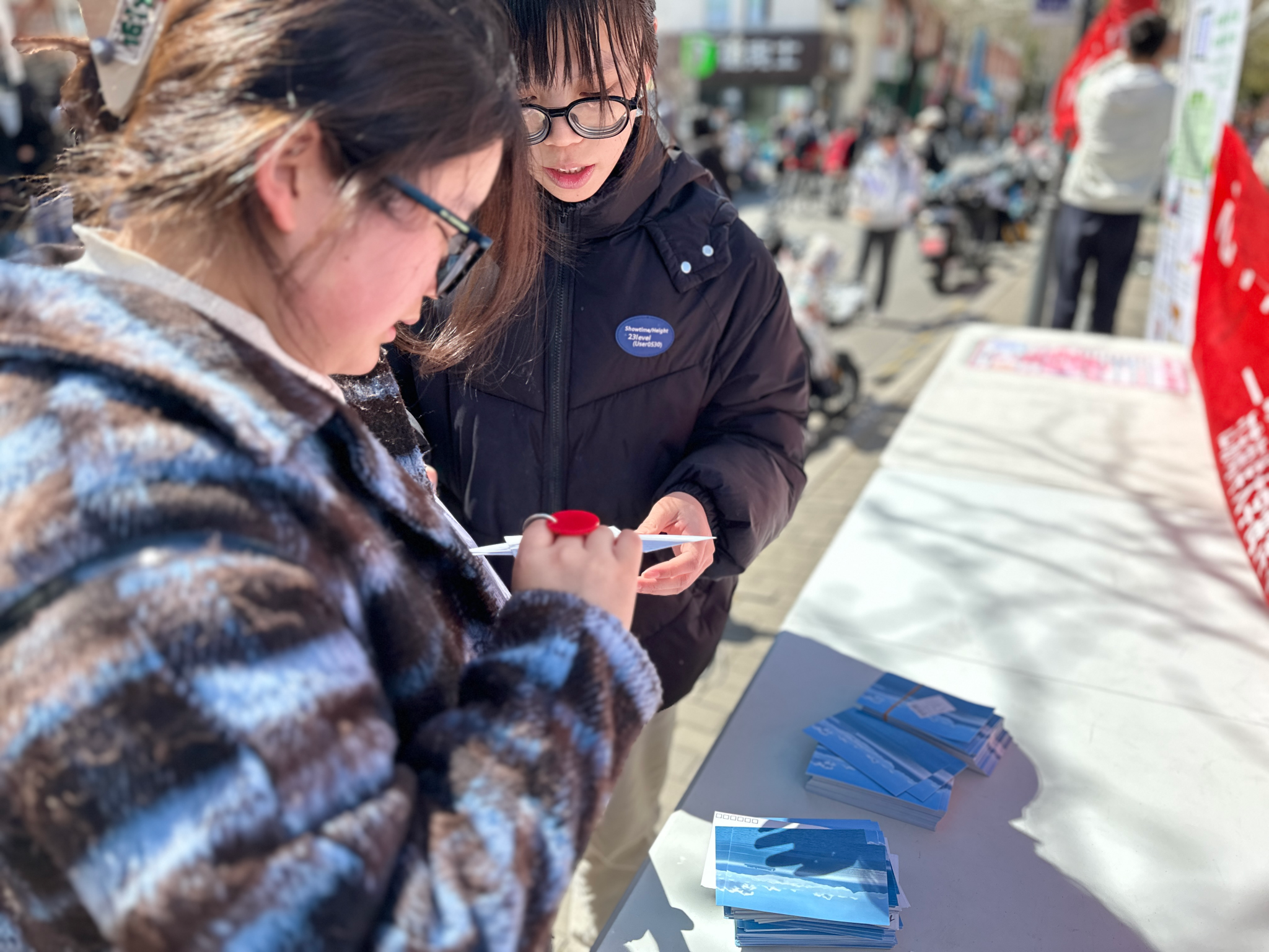 伴随初春阳光,“心手相牵 爱绘未来”公益活动如约在苍梧校区开展。路过的同学纷纷停下脚步,在组织者的讲解与引导下领取明信片,参与到活动之中。领取明信片后,同学们在上面写下对山区留守儿童的鼓励与寄语,表达自己最真挚的关怀与祝福,有的同学还挥动画笔,画上可爱的图案,一笔一划,将素白的明信片装点得充满温情暖意,仿佛有暖洋洋的热意。一张张小小的明信片不仅仅是一份关爱、一点祝福,更是一份邀约,它们像一个个寂静生长的种子发出了春天的邀请,这邀请有关梦想与希望、未来与成长。