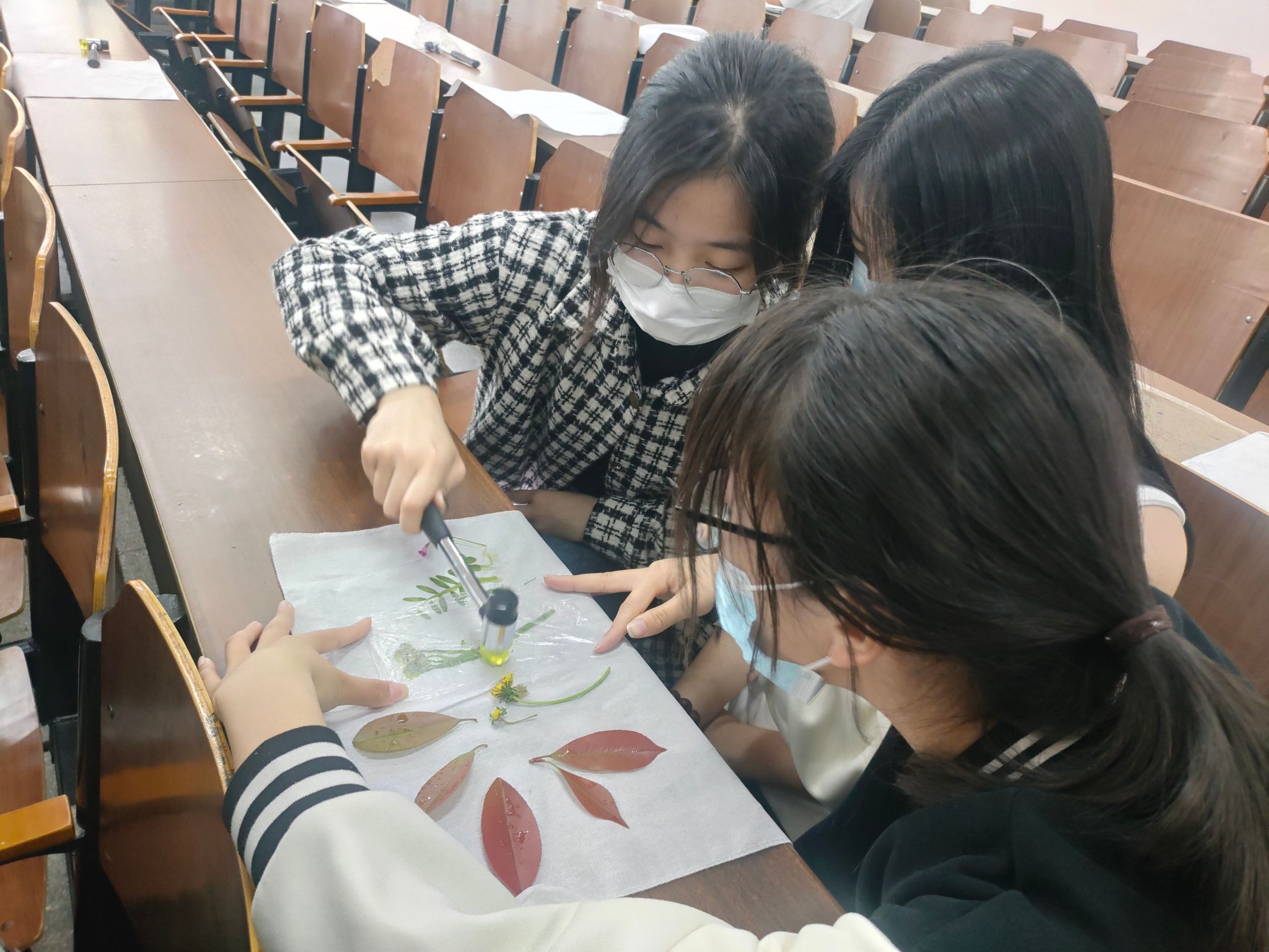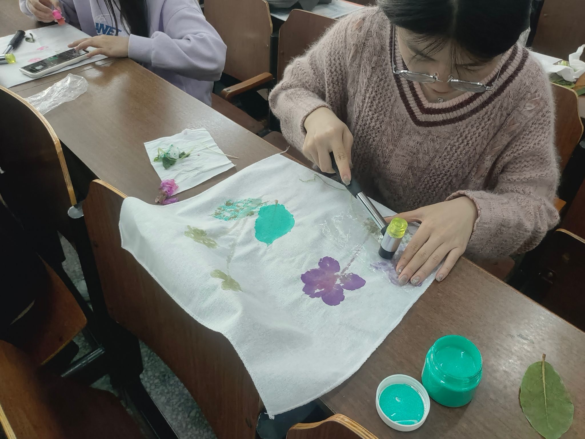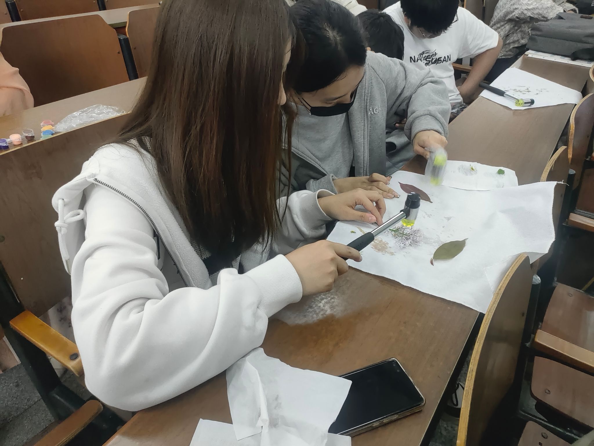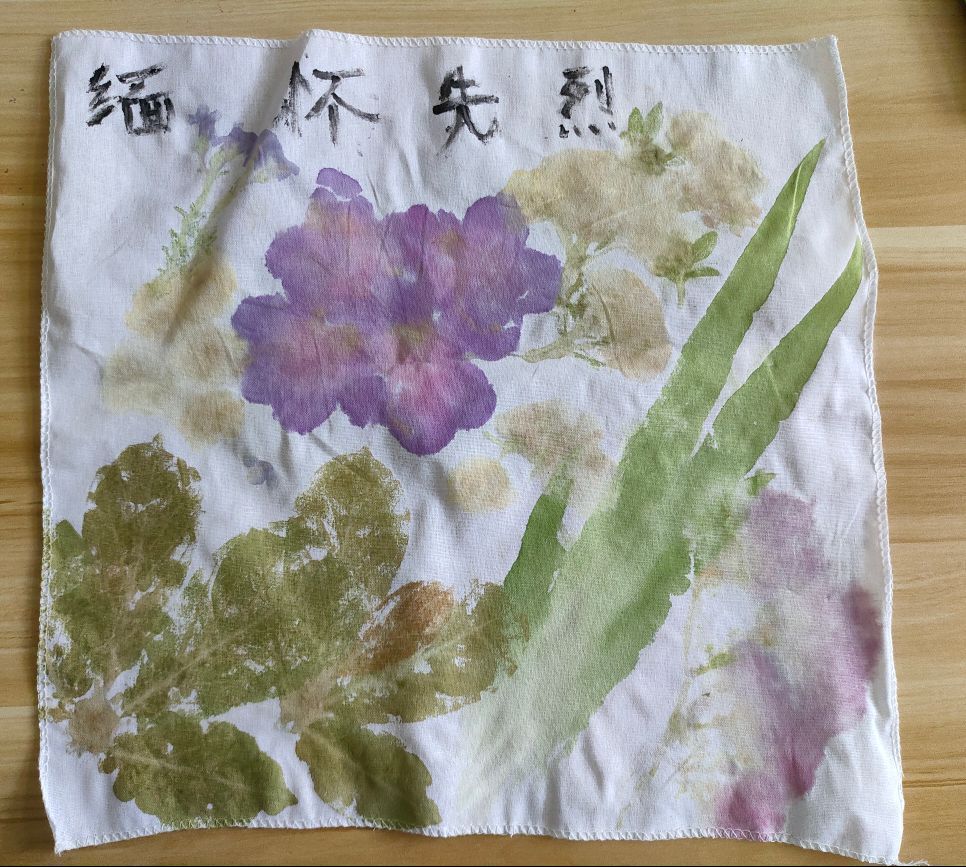 活动中同学们积极参与,向工作人员领取拓染材料,询问一些拓染技艺的关键要点。同学们采集素材后,通过固色、布局、敲打、晾晒等环节,将花叶的汁液拓在棉布上,待花叶与棉布融为一体即可取下,方成作品,锤花拓草间勾勒出植物美妙神奇的脉络图案。布料之上,方寸之间,是植物语言的书写,也是艺术最简单的呈现。一幅幅独一无二的作品翻飞在春风里,扬起汹涌的生命。同学们也写下了对革命英烈们的缅怀寄语,以自然寄托哀思,传扬生命真谛。