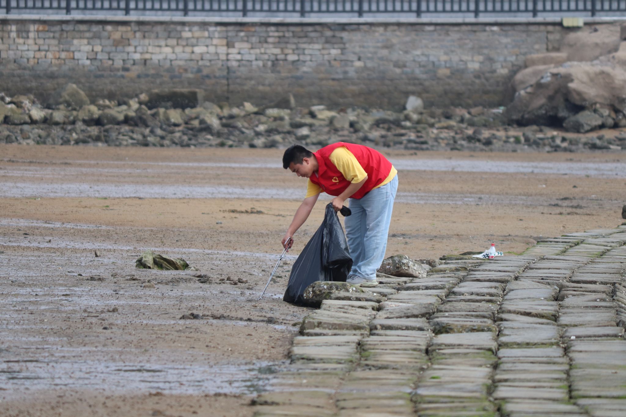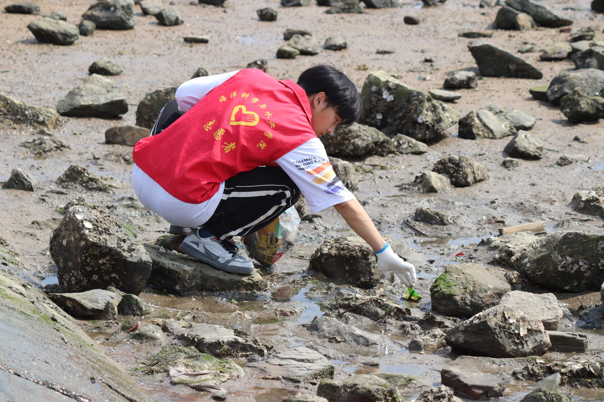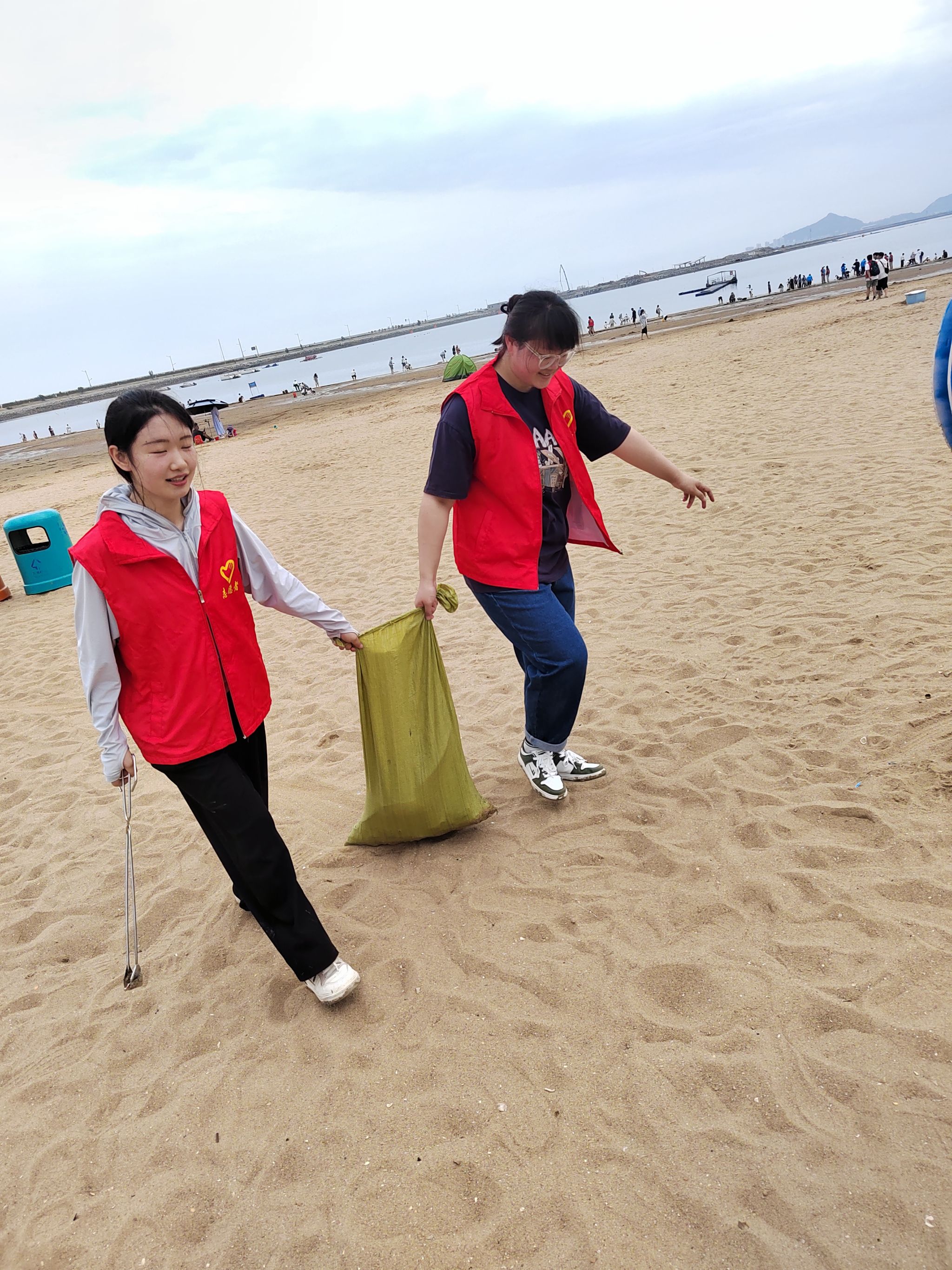 志愿者们来到沙滩后,迅速穿上红马甲、戴上手套,手持钳夹、垃圾袋等净滩工具,由集合点沿着沙滩向两边捡拾垃圾,大家三两成群、分工协作,互相配合将所到之处遇到的烟头、饮料瓶、编织袋、废弃渔具、塑料袋、废弃橡胶配件、碎玻璃等悉数捡拾装袋,在净滩过程中发现有些废弃渔具、船用配件等因时间久远而深深嵌入淤泥中,需要多人合力将其拖拽出来,过程中常常会喷溅一身的污泥,但是大家仍乐在其中、不知疲倦,不怕脏、不惧苦。用实际行动弘扬践行了雷锋精神,展现了新时代大学生的良好风貌。