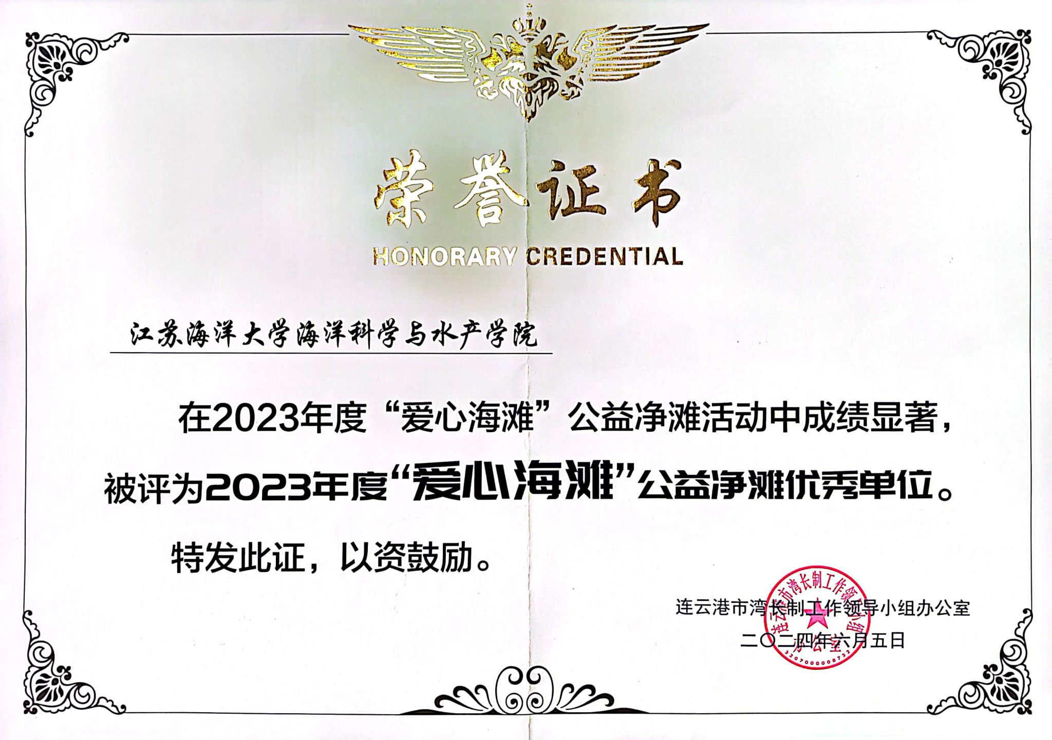 海洋科学与水产学院通过集中开展志愿服务系列活动,积极持续提升社会主义核心价值观教育质效,弘扬奉献、友爱、互助、进步的志愿精神。在近日举办的连云港市2024绿色发布暨生态文明宣传教育月启动仪式上,学院被评为“爱心海滩”公益净滩优秀单位。