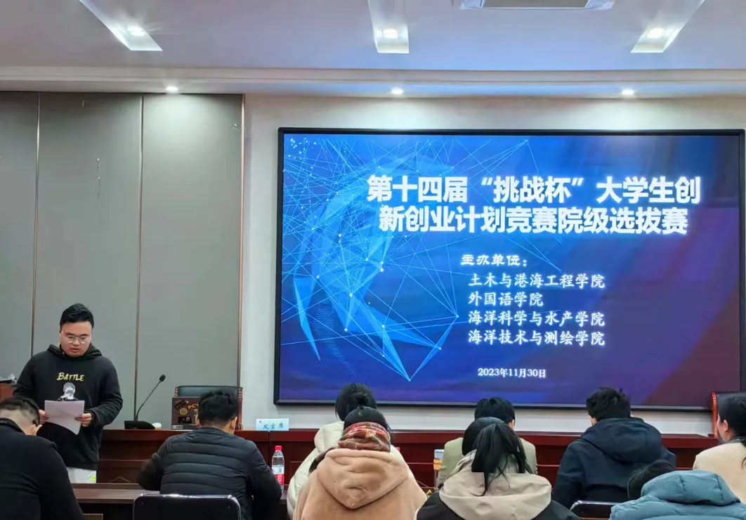 为进一步推动大学生创新创业教育工作的深入开展,培养大学生创新精神、提高大学生科研能力。2023年11月30日12时30分,由土木与港海工程学院、外国语学院、海洋科学与水产学院和海洋技术与测绘学院共同举办的第十四届“挑战杯”大学生创新创业计划竞赛院级选拔赛于江苏海洋大学苍梧校区土木楼南楼207顺利开展。