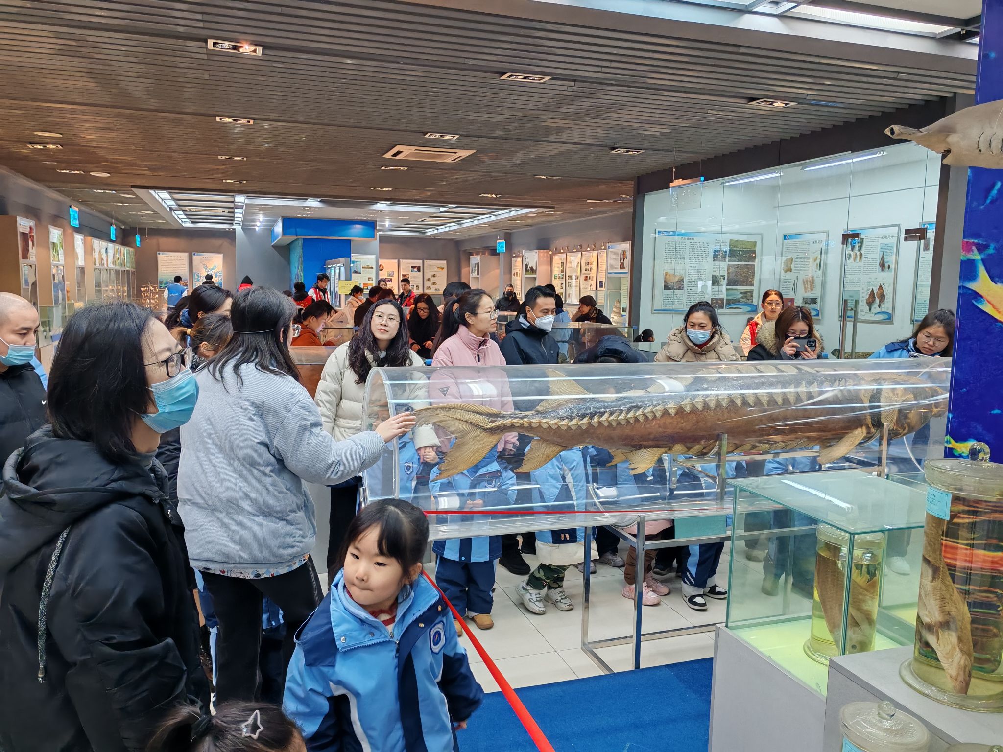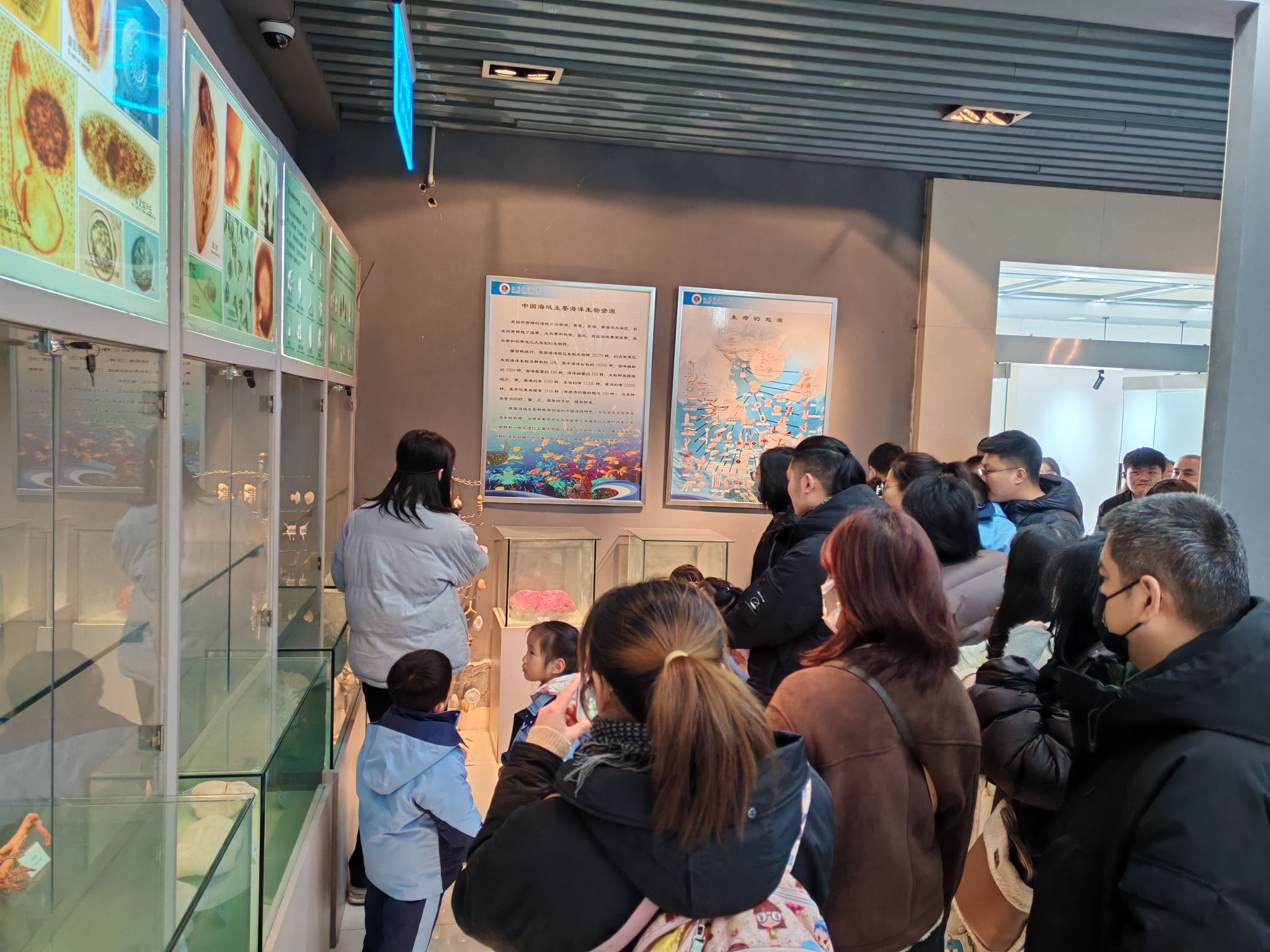 孩子和家长们首先来到江苏海洋大学海洋馆,开启了一场奇妙的海洋之旅。馆内陈列着各种海洋生物标本,从五彩斑斓的热带鱼到形态各异的贝类,从深海的神秘生物到浅滩的寻常虾蟹,无一不吸引着孩子们充满好奇的目光。海科院的志愿者们用生动有趣的语言,为孩子们揭秘海洋生物的生活习性,激发他们对海洋世界的探索欲望。