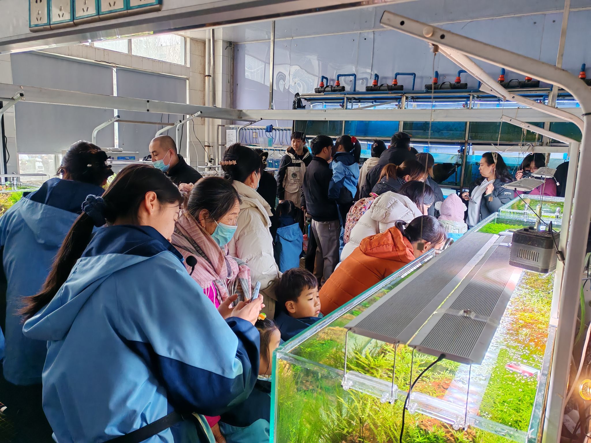 随后,大家来到江苏海洋大学水族造景工作室,被色彩斑斓的鱼类、形态各异的水草和精美的造景深深吸引。孩子们通过观察,了解了水循环、食物链等自然规律,培养了尊重生命的爱心和责任感,同时也初步认识了自然界的运作方式。