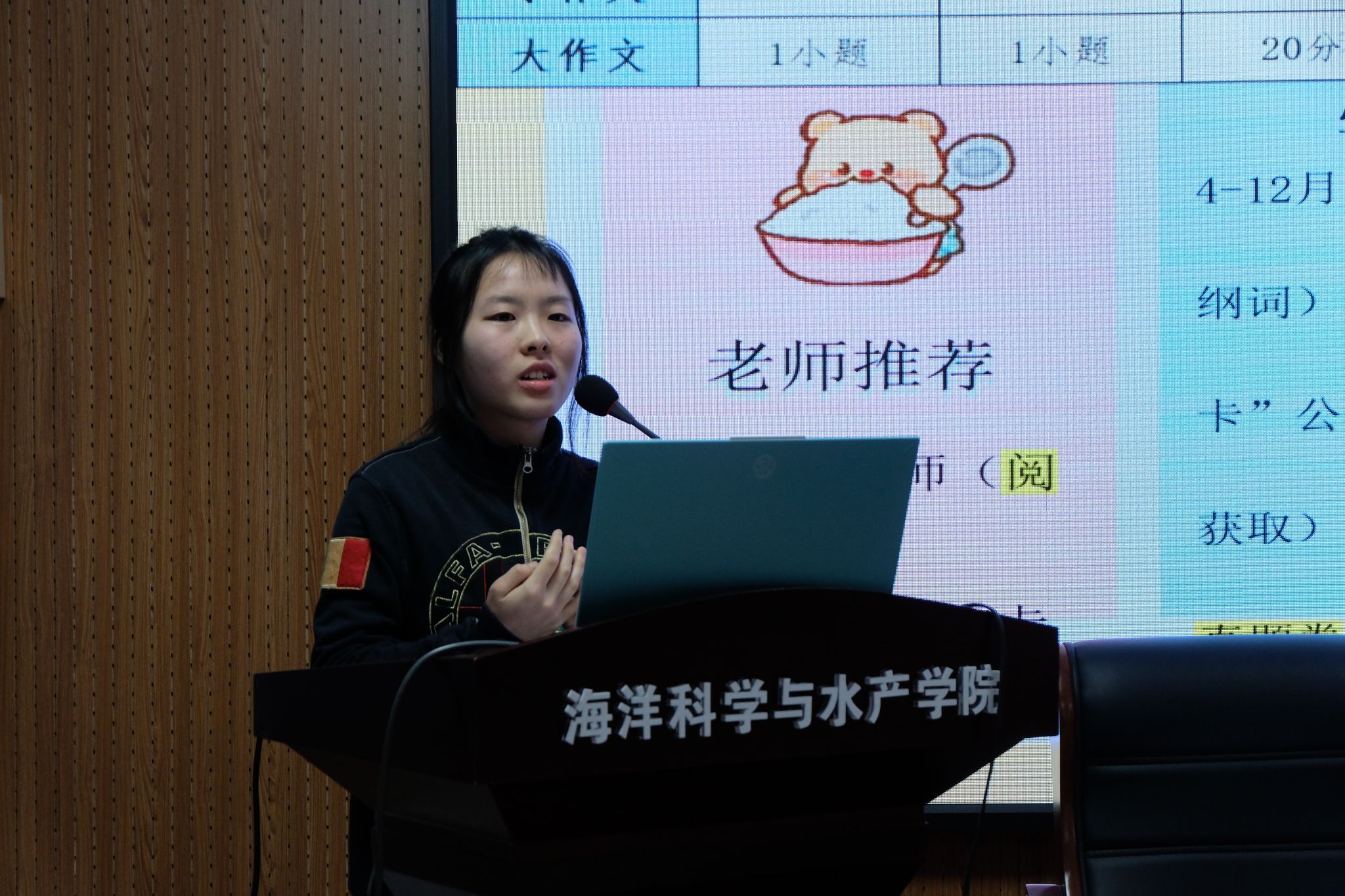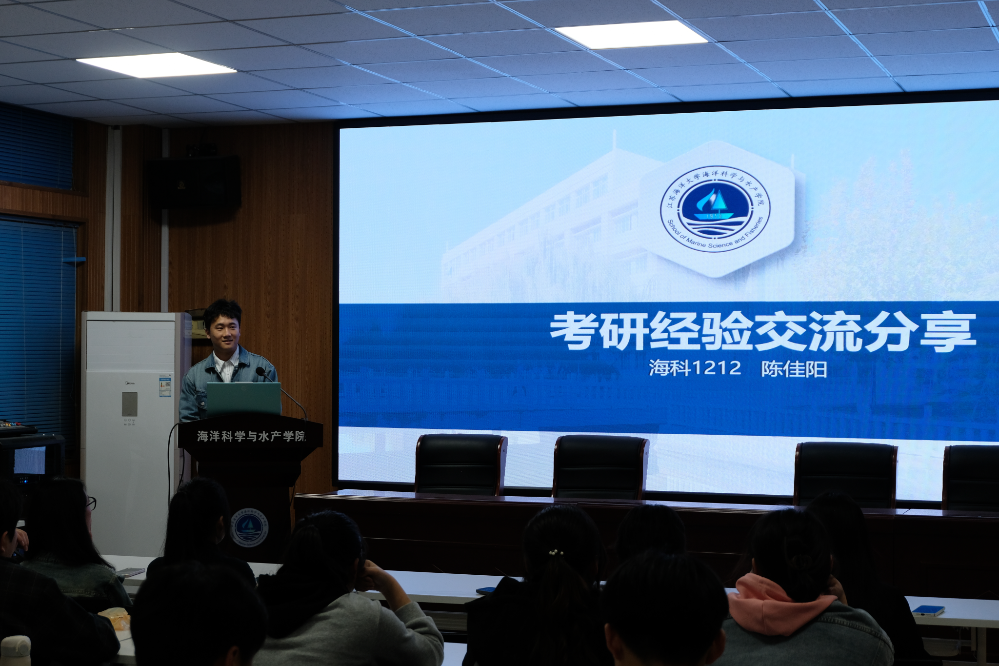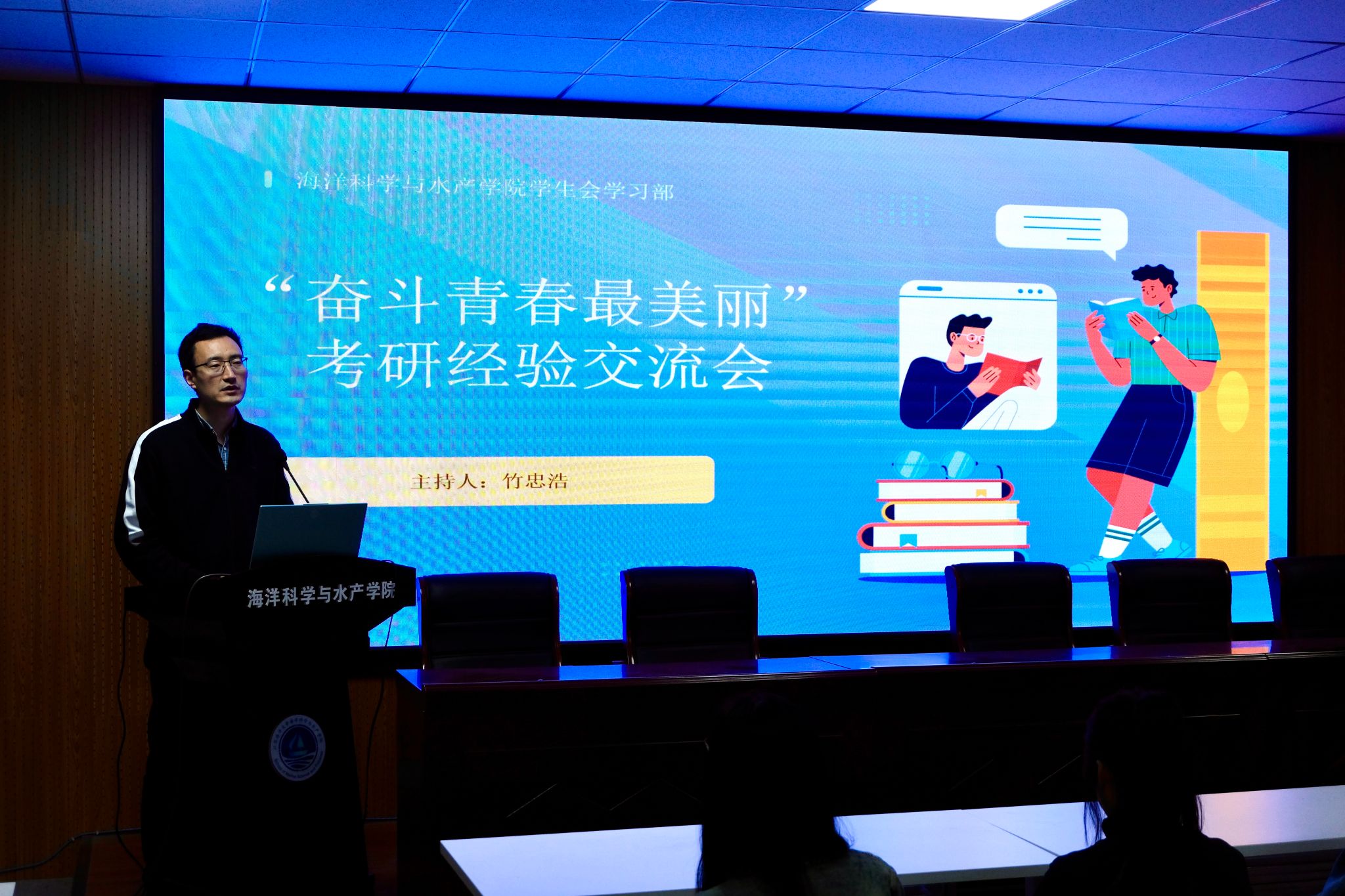 4月18日晚,由海洋科学与水产学院学生会主办的考研经验分享会在海洋南楼203室成功举办。本次活动以“薪火相传,研途相伴”为主题,吸引了近百名怀揣考研梦想的学子参与。学习部竹忠浩同学担任主持,唐振新老师作为特邀嘉宾出席。