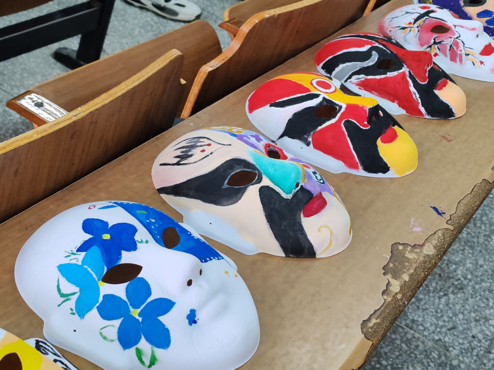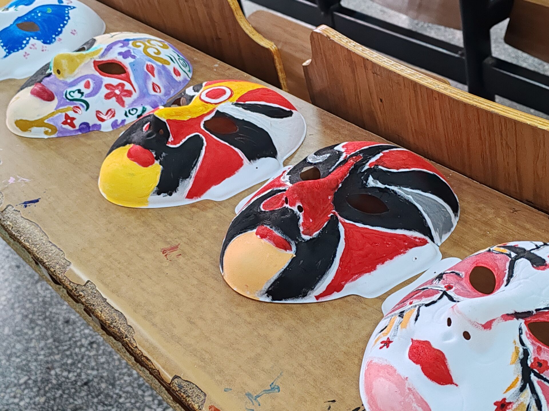 创作环节中,同学们全神贯注伏案勾勒,画笔蘸取颜料的细微声响与纸面摩擦的沙沙声交织。有人反复调整图案布局,有人则直接以颜料大胆填色,以浓烈的大红色奠定面具主色调,再用黑色勾勒,用渐变的蓝紫色表现脸谱的神秘感。所有同学都沉浸在自己的世界里,用心创作着心目中最美的脸谱,每个人都在用心去感受传统文化所带来的魅力,用行动书写对艺术的理解和对文化传承的实践。淡黄色颜料如月光流淌,顺着面具的弧度晕染出朦胧的光晕;深蓝色颜料被刻意刮擦,形成斑驳肌理,似古老城墙的岁月痕迹,传统戏曲元素与现代艺术表现手法在方寸面具上交相辉映。
