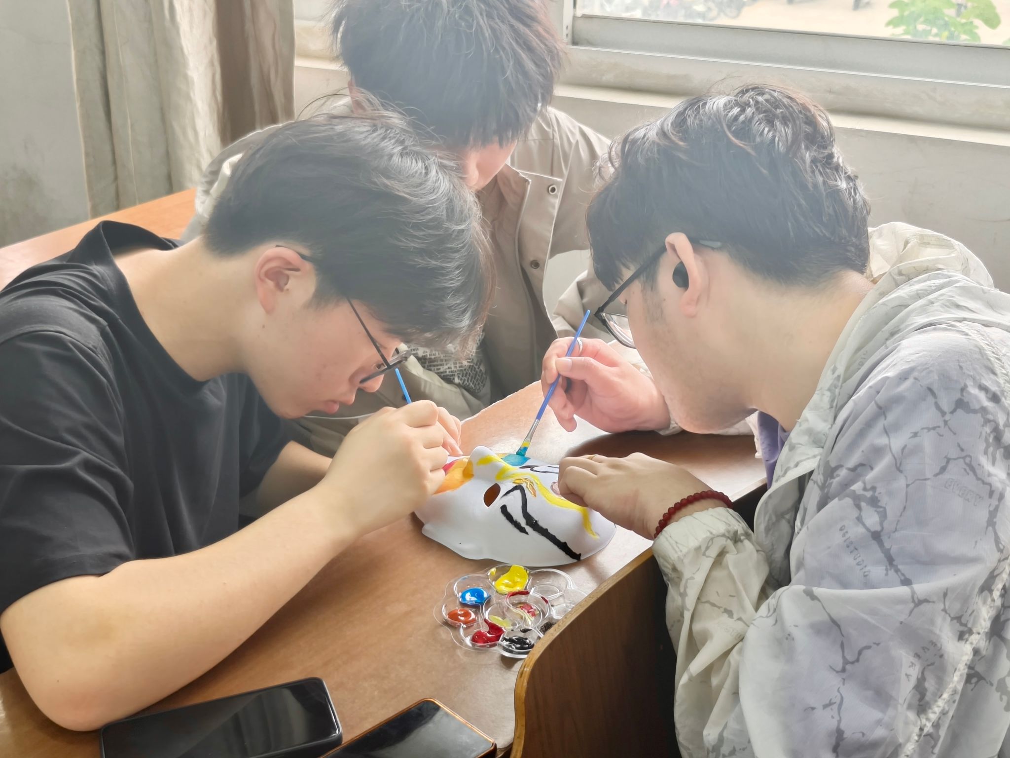 活动现场,工作人员穿梭其中,为每位参与者分发素色纸质面具、调色盘、粗细勾线笔及专业丙烯颜料。
