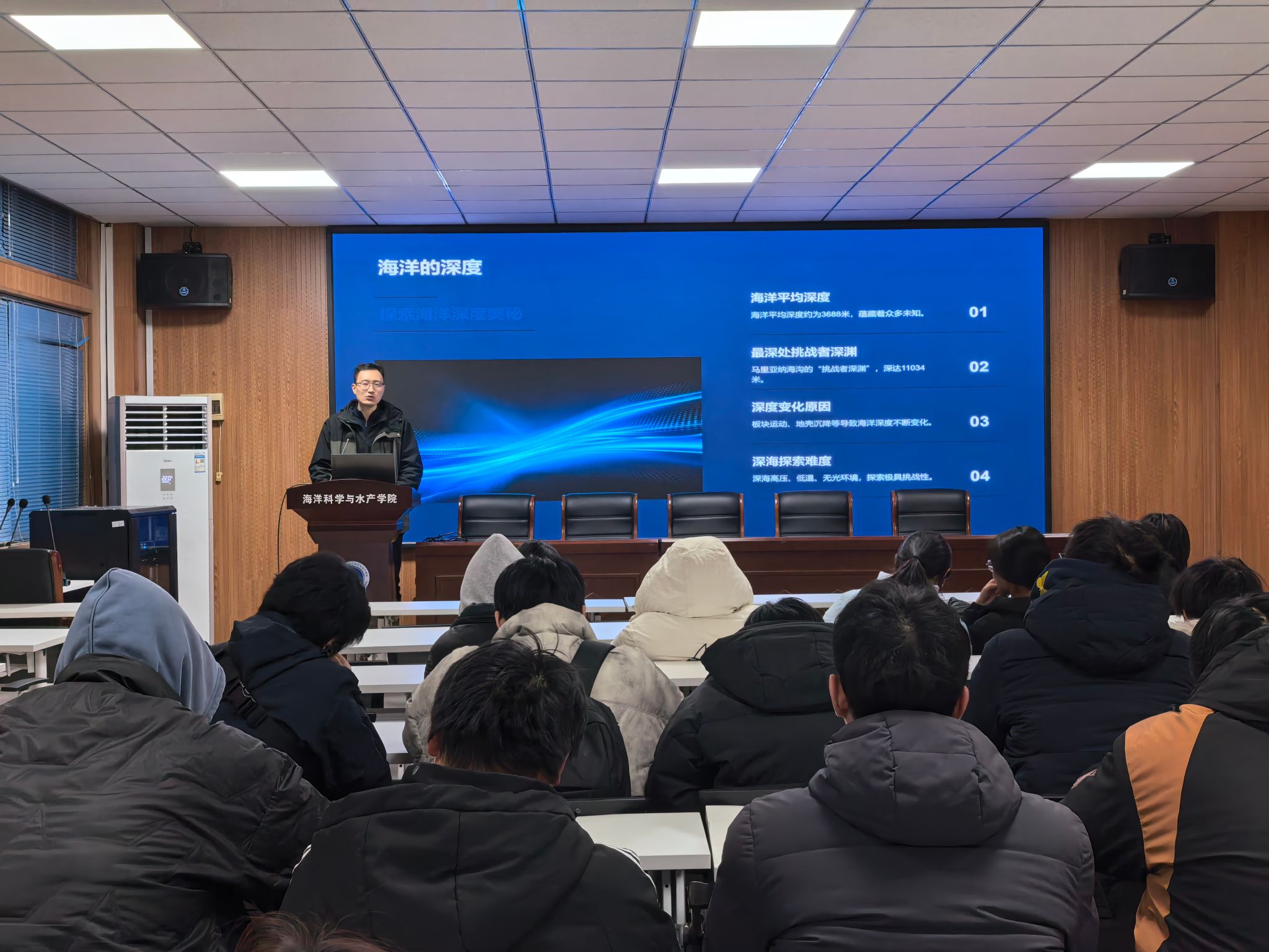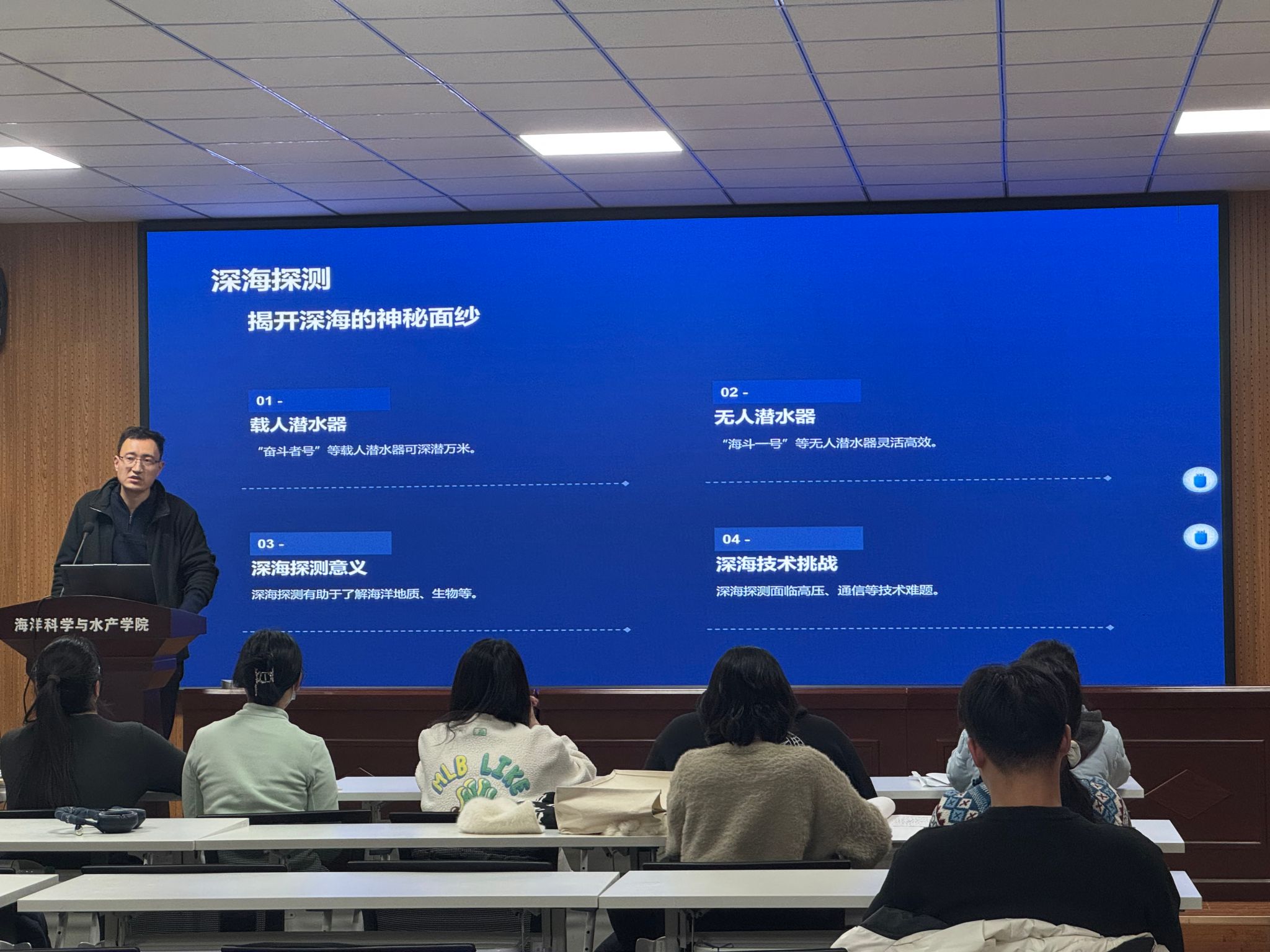为深入贯彻落实国家海洋强国战略,提升大学生海洋科学素养与家国情怀,激发投身海洋事业的报国热情,2025年12月2日、3日,海洋科学与水产学院团委书记唐振新在海洋南楼203为海科1251班学生及海科专业学生党员带来了一场题为“走进深蓝:认知、责任与未来”的海洋知识科普讲座。