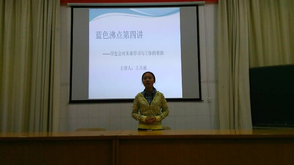 报告会上,校学生会主席王凡迪首先发言,她向全体出席人员讲述了学生会对未来学习和工作的帮助。她结合自身经历,讲述了进入学生会后的心理变化,以及如何处理学习与工作的关系。王凡迪告诉学生干部要养成主动联系他人的习惯,少说话,多做事,多思考。